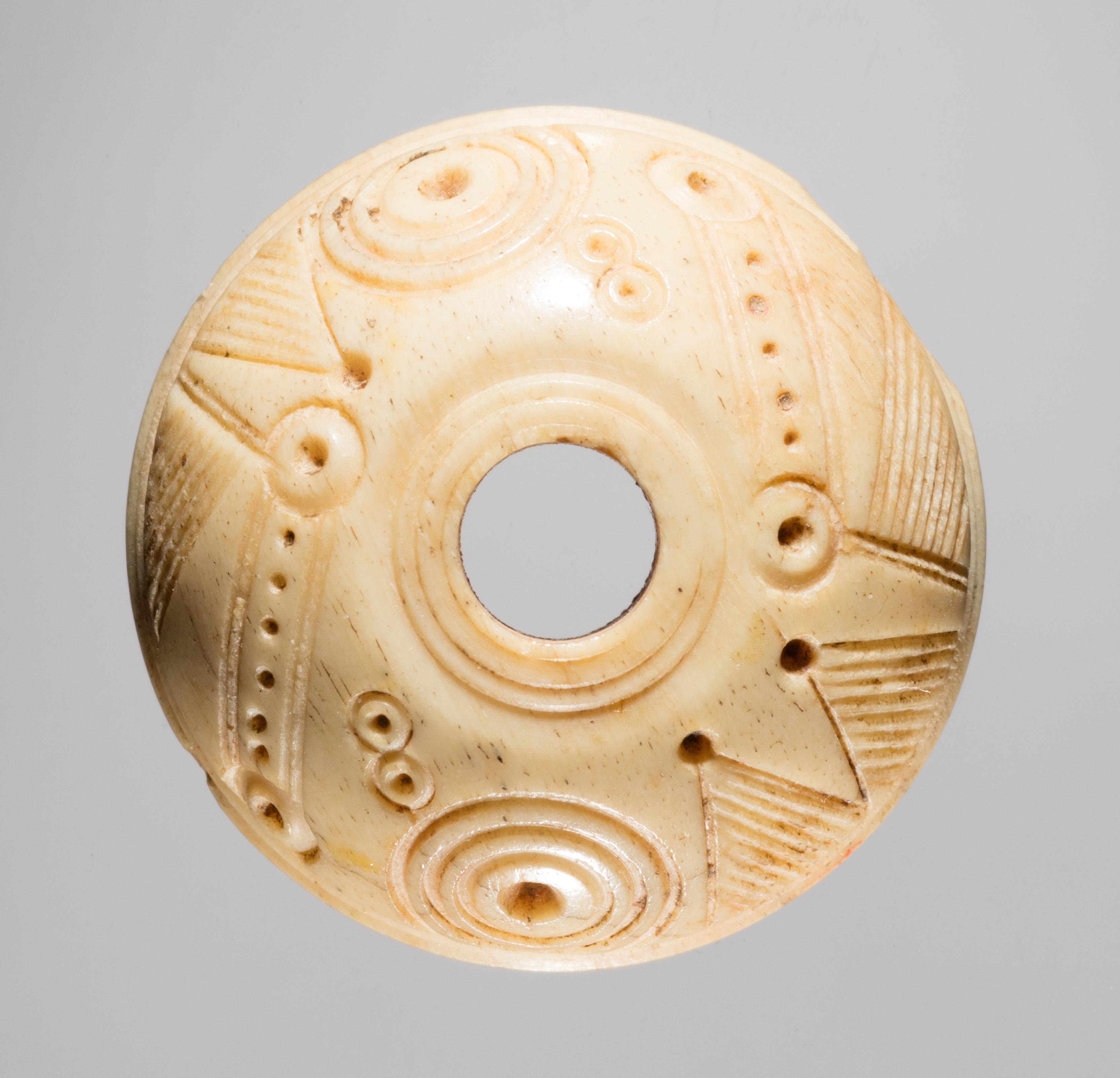 Spindle Whorl by Unknown Artist. A light beige, round object with a hole in the center. The object has a smooth surface with various carved designs including circles, triangles, and lines. The carved designs are arranged in a pattern around the object. There are small holes along some of the lines. The background of the image is gray.