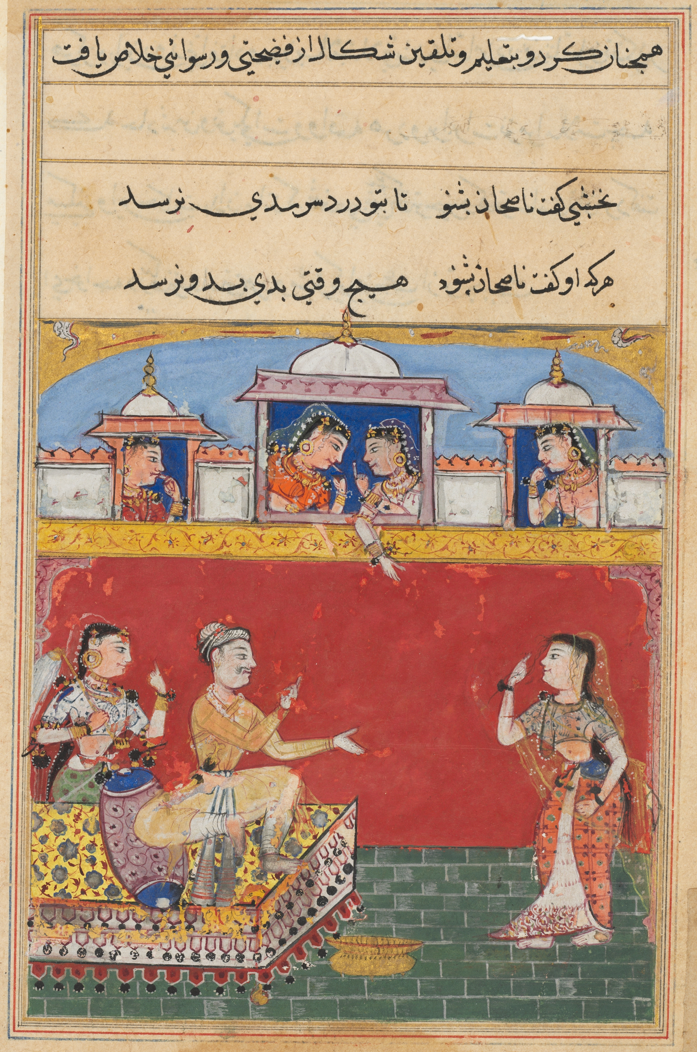 Kaiwan sends a message of love to Khurshid, wife of his brother Utarid who is away on a journey, from a Tuti-nama (Tales of a Parrot): Thirty-second Night