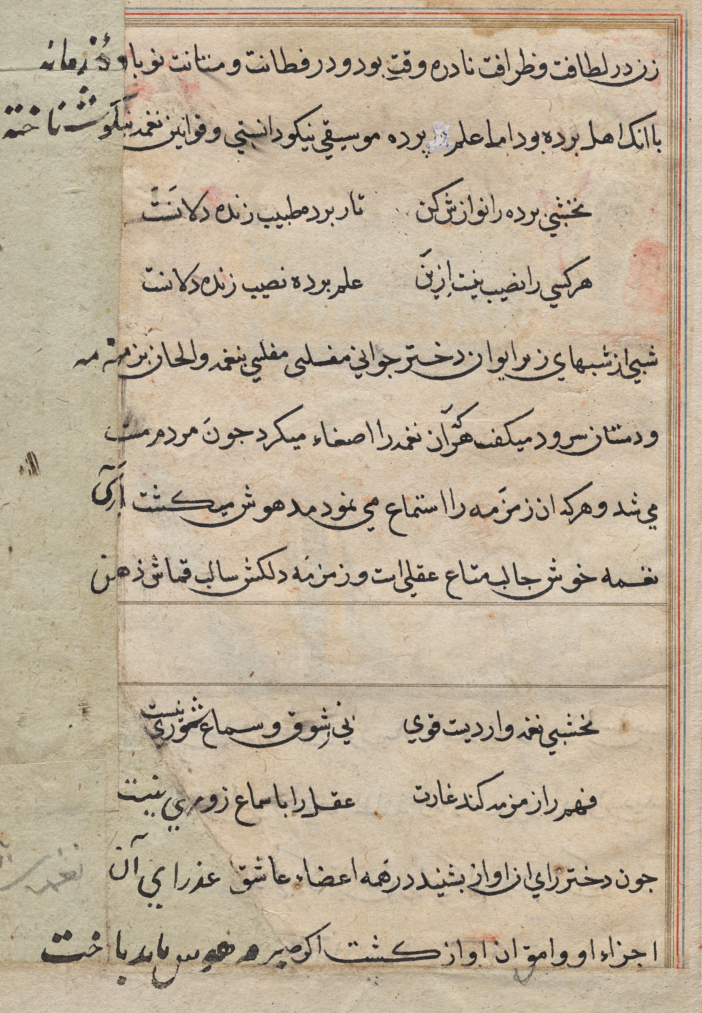 Page from Tales of a Parrot (Tuti-nama): text page. The image shows a piece of aged paper with writing in a language that appears to be Arabic script. The paper has a light-brown color with darker brown spots and lines throughout. The writing is black and takes up most of the page, with some red marks scattered throughout. The text is written in a flowing script and appears to be in a single column. The page has a thin border around the edges, with two thicker lines on the right and bottom sides. The lines are red, green, and gold in color. The overall appearance of the page suggests that it is an old, possibly hand-written manuscript. The text runs along the page in 23 lines with a line space between the 16th and 17th lines.