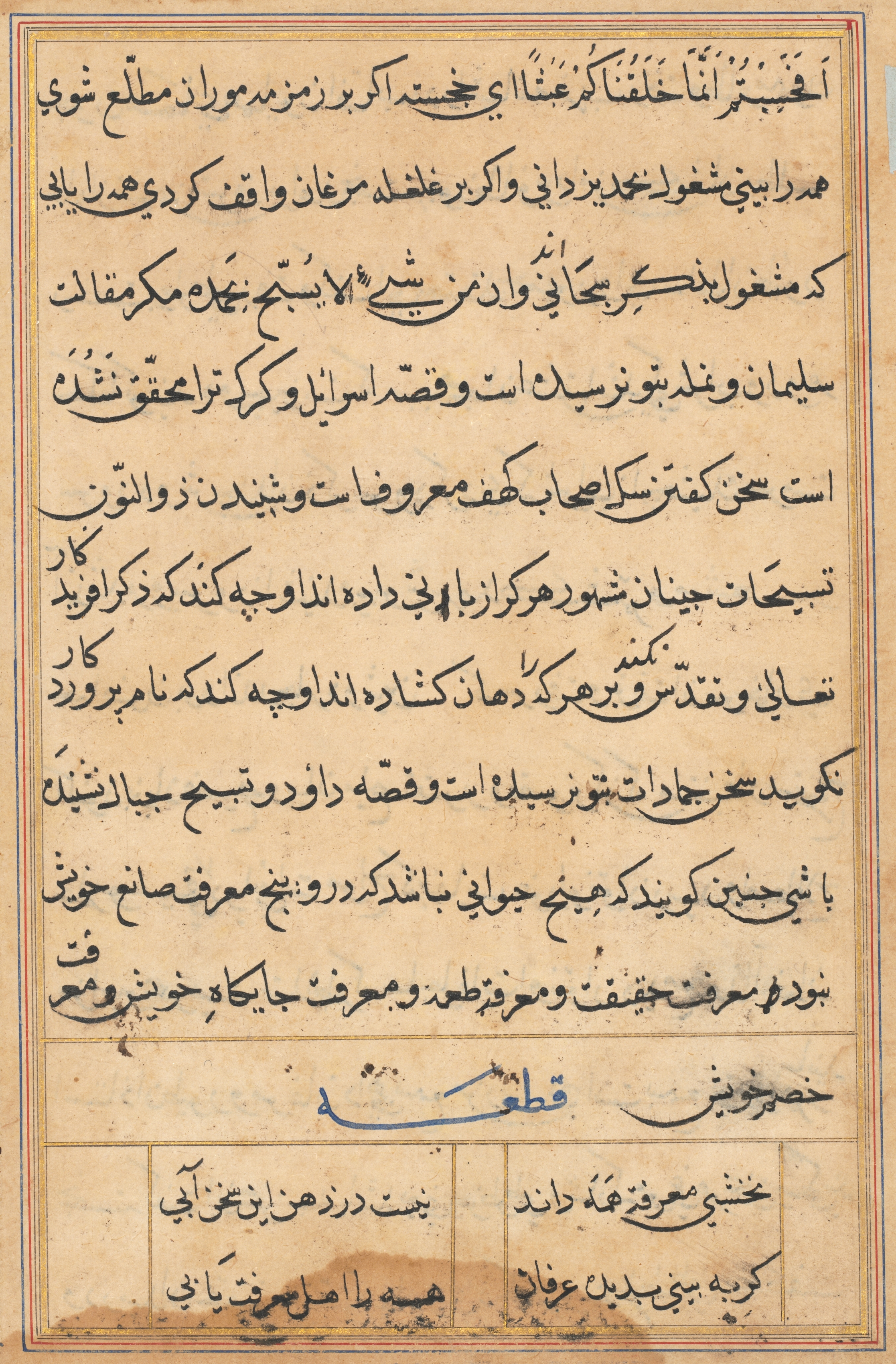 Yellowed page with black text written in a foreign language, possibly Arabic or Persian, featuring a large block of text in the main section and a smaller block of text at the bottom, all contained within a thin red border.