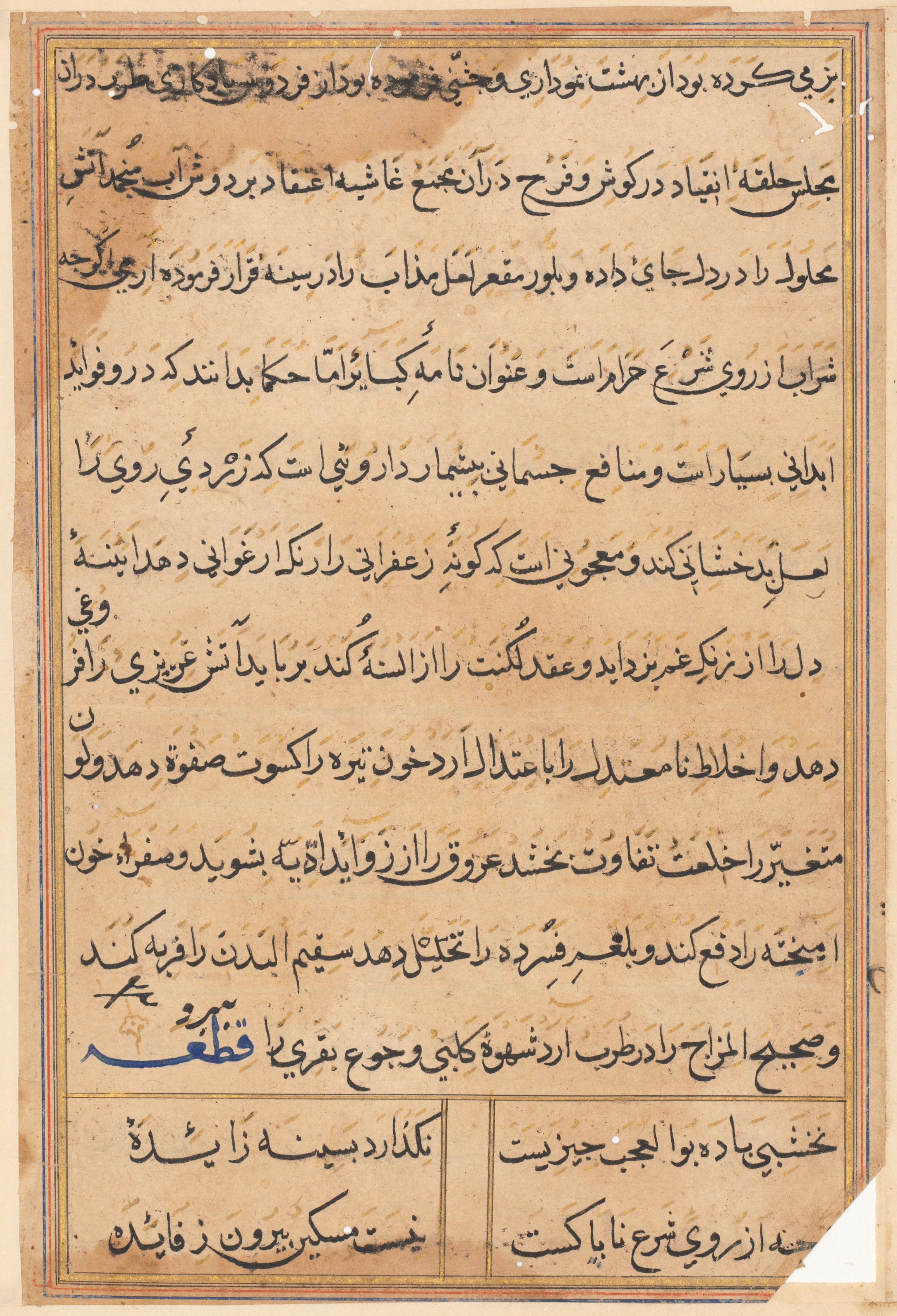 A page from a book written in Arabic calligraphy. The background color is light brown. It includes 3 sections of text written in black ink. The text fills most of the page with writing in a single column. A thin orange line borders the text, and a thicker orange line borders the page. A small section in the bottom right corner contains blue ink. The bottom right corner edges are white. A thin line separates the bottom section. A thicker line separates the two bottom boxes. The top box is wider. The image shows a crack on the bottom right.
