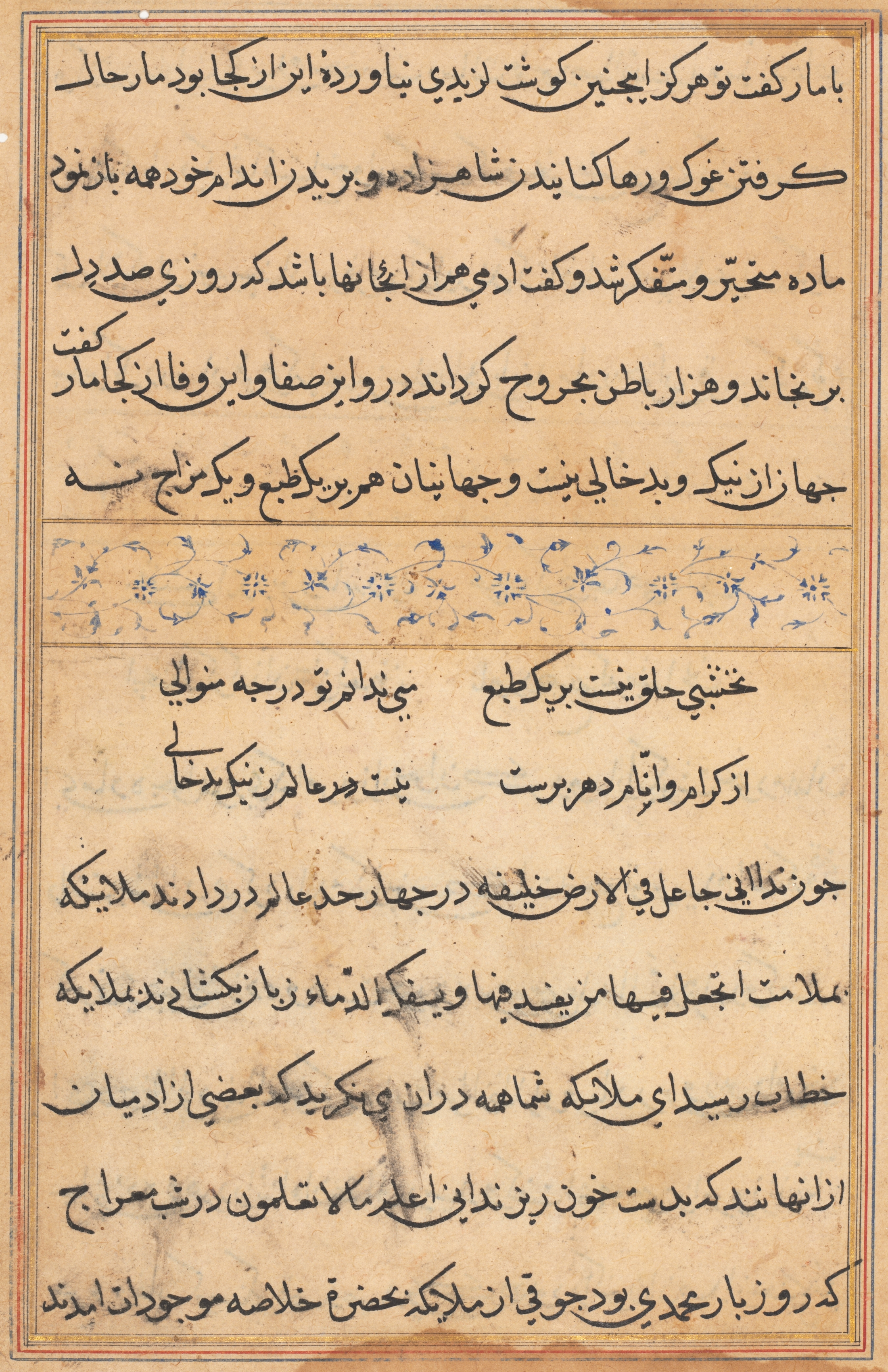 A yellowed manuscript page of text written in Arabic script. The page is divided into two sections with a decorative blue and gold floral design in between. The text fills the page and is written in black ink. A thin gold line borders the left and right edges of the page. Below the gold line on the left edge is a thicker red line. A similar border on the right edge is not visible. The top and bottom edges of the page are rough and yellowed, like old paper.