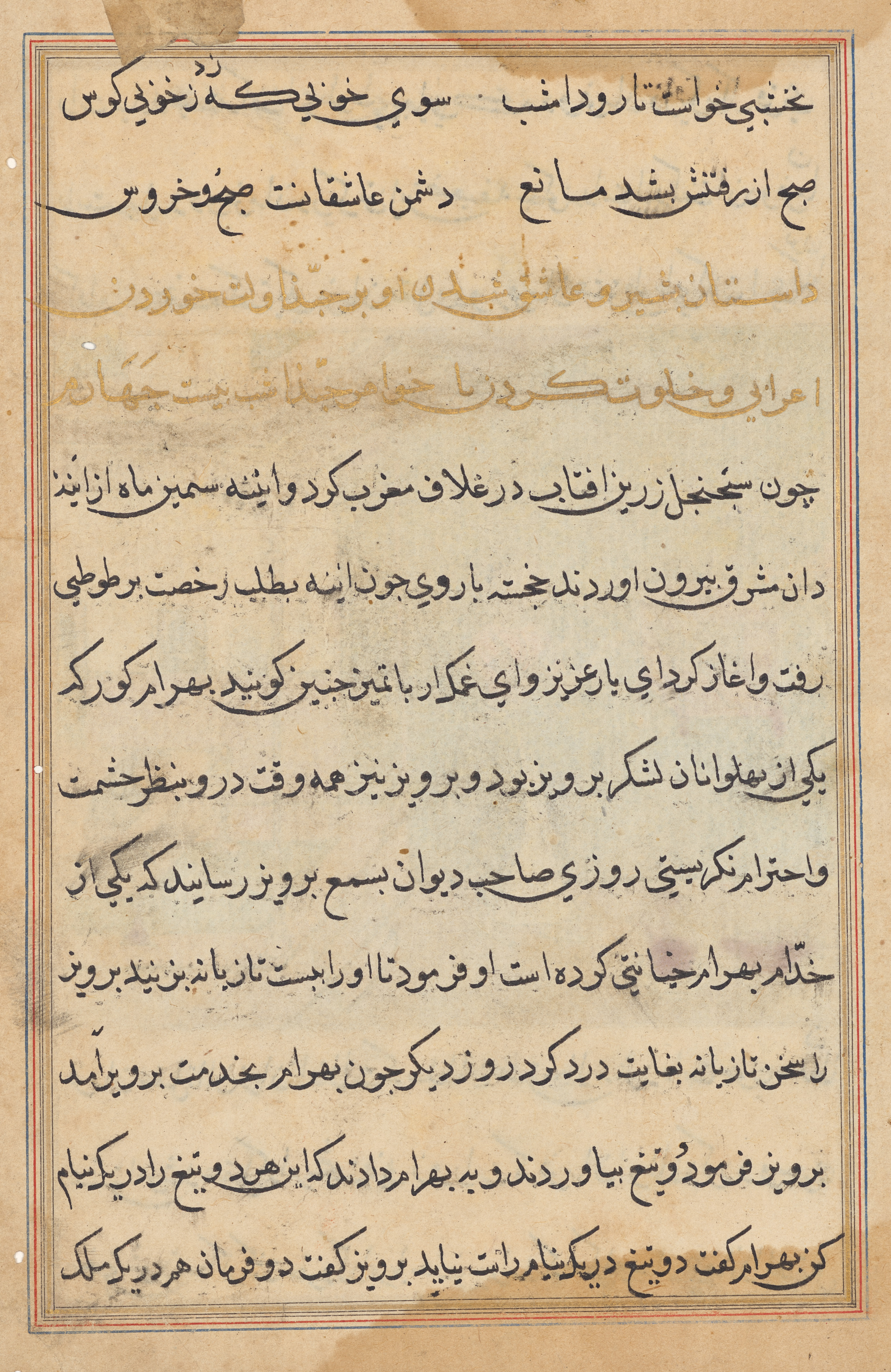 Beige-colored page with darker beige stain on top left corner and darker beige mark on bottom left corner; darker beige border on all sides; dark blue line on inside of border; written in black ink; 2 columns of text; additional text on top line; text written in Arabic script. Tales of a Parrot (Tuti-nama): text page by Unknown.