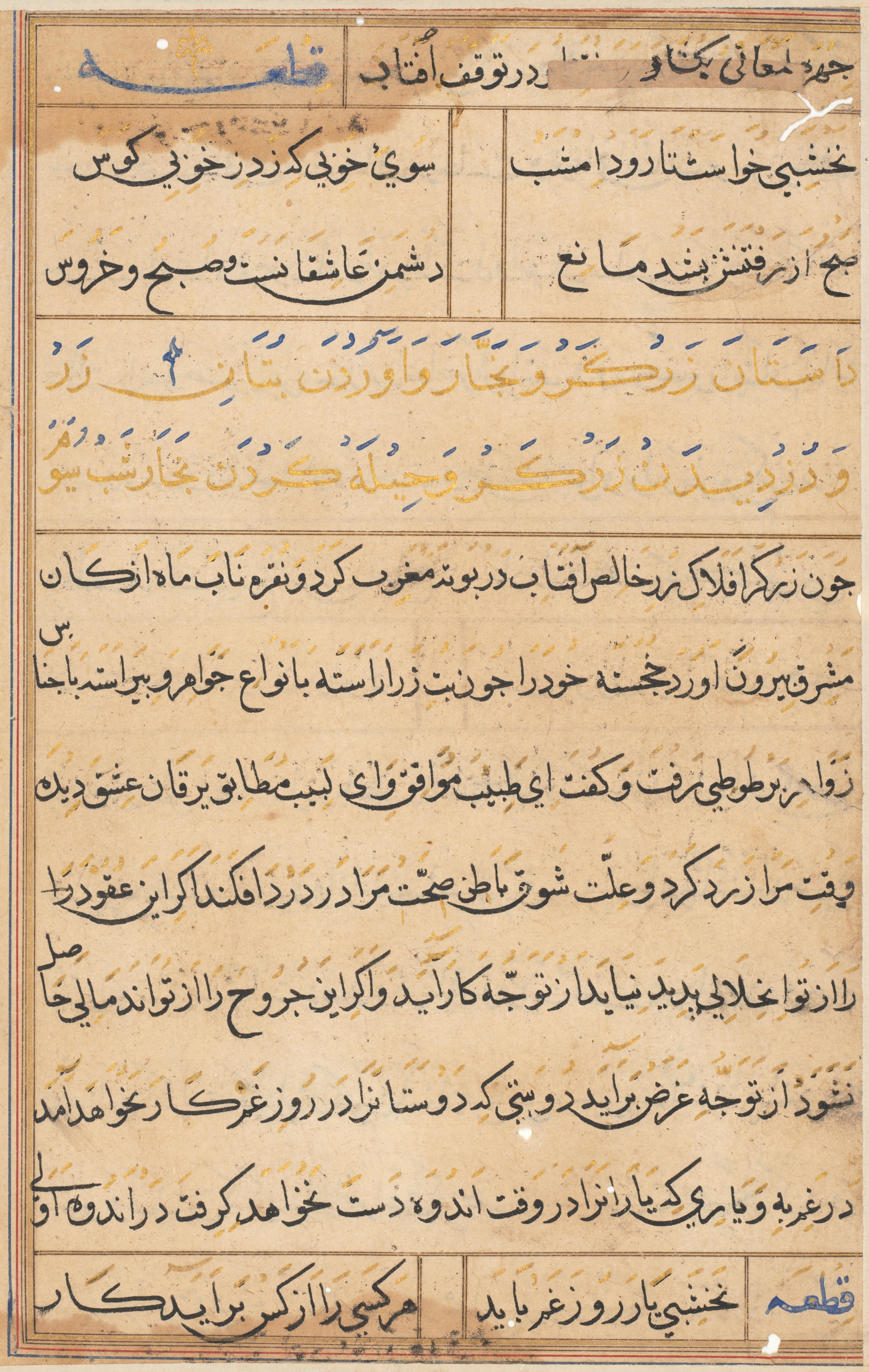 A yellowed page with brown stains and darker borders. The page is divided into sections by thin black lines. The top section contains writing in blue ink. The majority of the page is filled with black, blue, and yellow text written in a foreign script. A thicker black line borders the left and top edges of the page. Small blue marks appear throughout the text. A thicker blue line is at the bottom of the page. A box at the bottom right contains blue writing. The artist and title of the work are "Tales of a Parrot (Tuti-nama)".