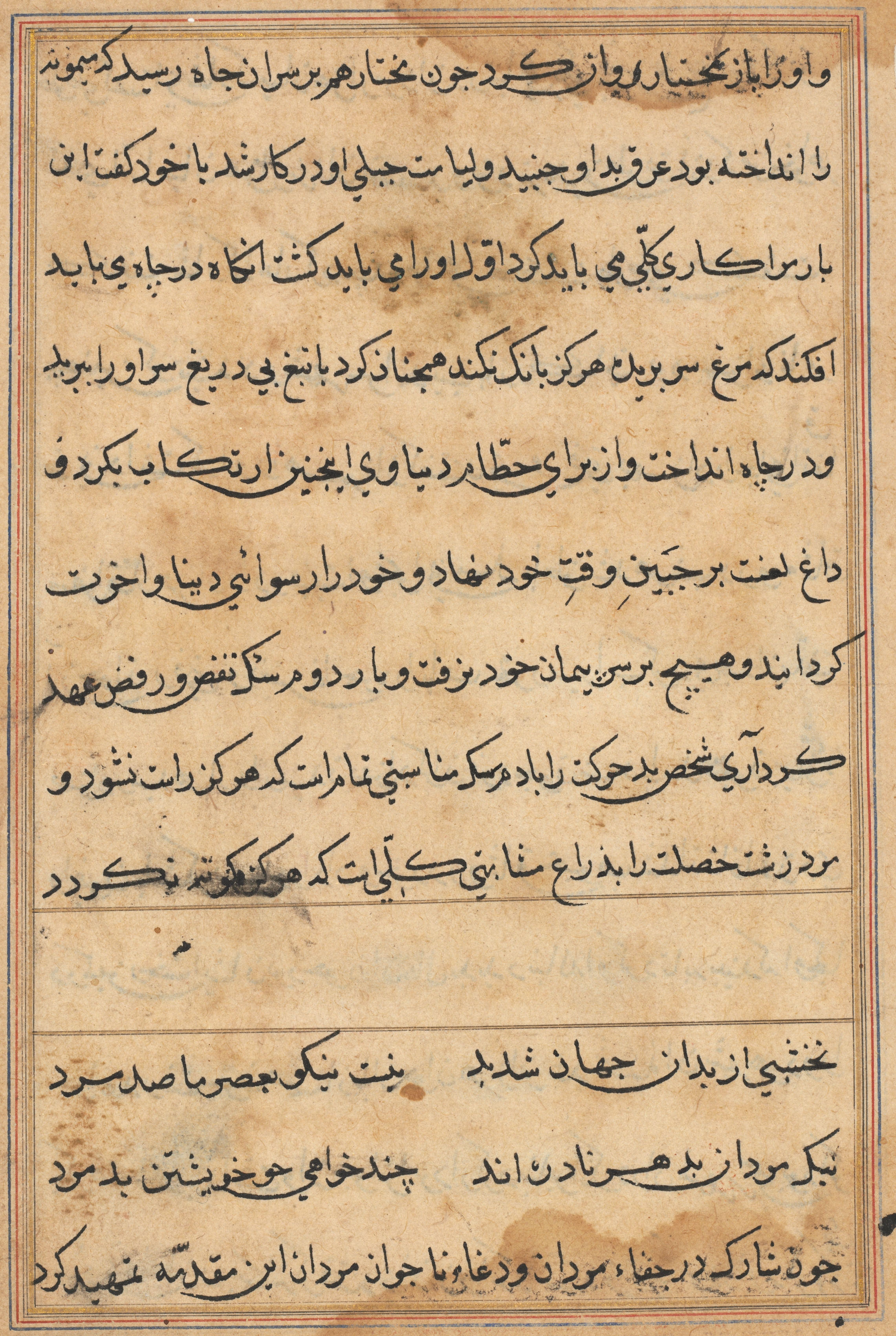 Brown parchment page with black ink writing in an Arabic script. Text fills most of the page, written in lines that run horizontally across the page. The lines are not perfectly straight. A darker brown border surrounds the page, with a thinner red line on the inside and a thicker brown line on the outside. The page is shown with the right edge and a portion of the top edge. Small dark stains are scattered across the page. A thicker band of text appears across the bottom with a larger gap between it and the text above.