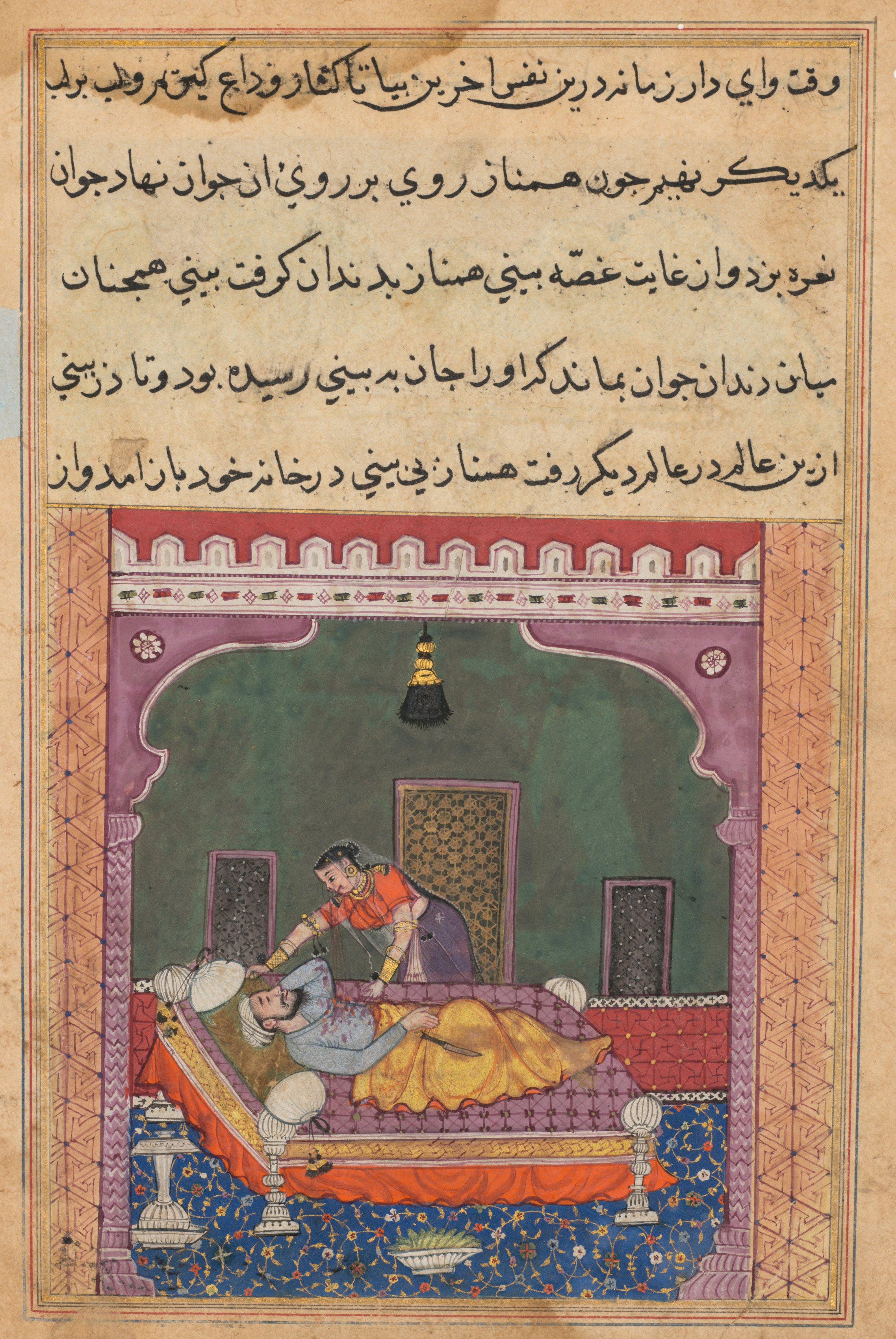 A colorful illustrated scene from a manuscript. The scene shows a man and woman on a bed, inside a room. The bed has a short platform with white decorative posts at each corner. A woman wearing a purple sari and orange shirt with gold bangles on both wrists, sits beside a man, wiping his face with a cloth. The man lies on his back with his head on a pillow. He wears a blue shirt with billowy sleeves. A knife with a blood-stained blade lies on the floor beside the bed. The woman's nose appears to be bleeding; blood drips from her nose onto the man's clothes. The room has green walls, a patterned rug on the floor, a red and white border and a small hanging light fixture. The image has a border with intricate geometric designs, and there is text written in a foreign language at the top.