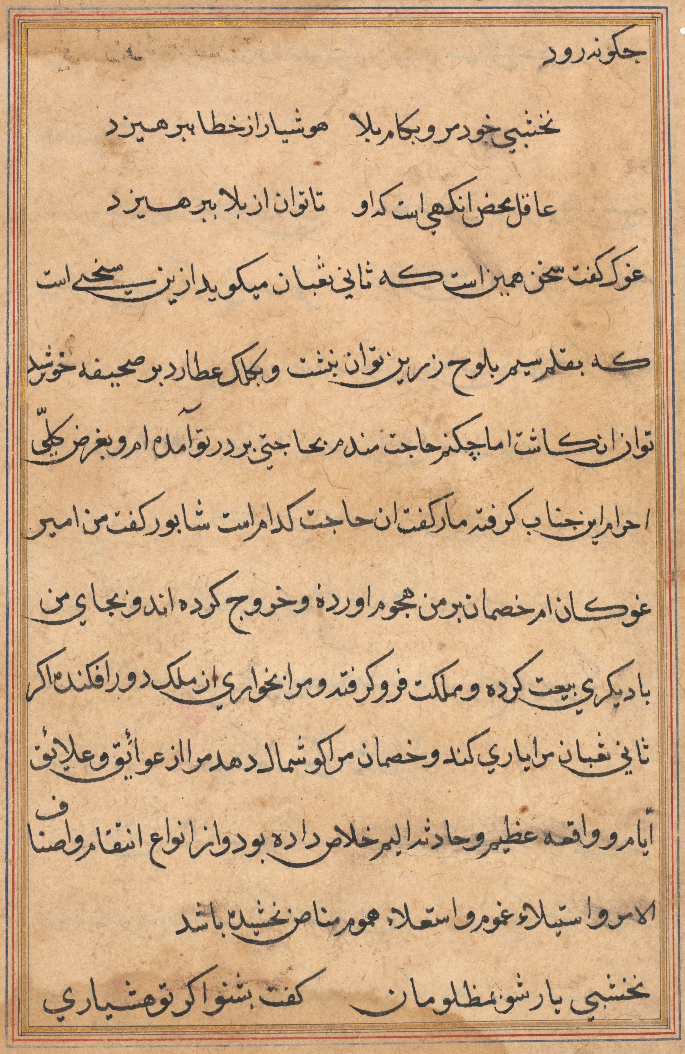 The image shows a page from a book written in Arabic script, likely from the Mughal or Persian tradition. The page is yellowed with age and has a brown border around the edges. The text is written in black ink and consists of 22 lines of calligraphy. The script appears to be a style of Nasta'liq, which was commonly used in Persian and Urdu manuscripts. The text is densely packed, with no illustrations or images on the page. The background of the page is a light-brown color, with darker brown spots and discoloration throughout, suggesting age and wear. A small inscription appears in the top-right corner. The overall appearance suggests an antique or historical manuscript. Title: Page from Tales of a Parrot (Tuti-nama): text page. Artist unknown.