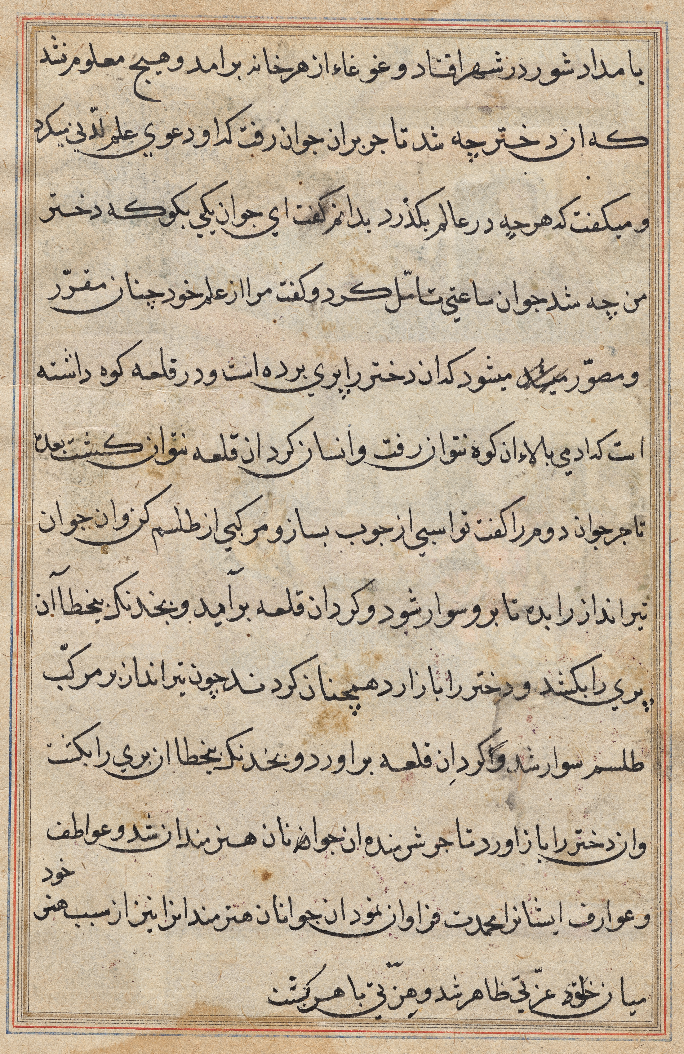 The image depicts a page from "Tales of a Parrot (Tuti-nama)" by an unknown artist. The page is filled with black text written in a foreign language, likely Arabic or Persian script. The text is arranged in paragraphs and covers most of the page. The background of the page is aged and yellowed, with visible signs of wear and tear. A thin red border surrounds the page, adding a pop of color to the otherwise monochromatic design. The border consists of two lines, one thicker than the other, and is visible on all sides of the page. The overall appearance suggests an aged manuscript or book page. The text is written in a flowing script, with intricate lettering and diacritical marks. The page appears to be a text page, with no illustrations or images present. The aged appearance and traditional script suggest that the page is from an older book or manuscript.