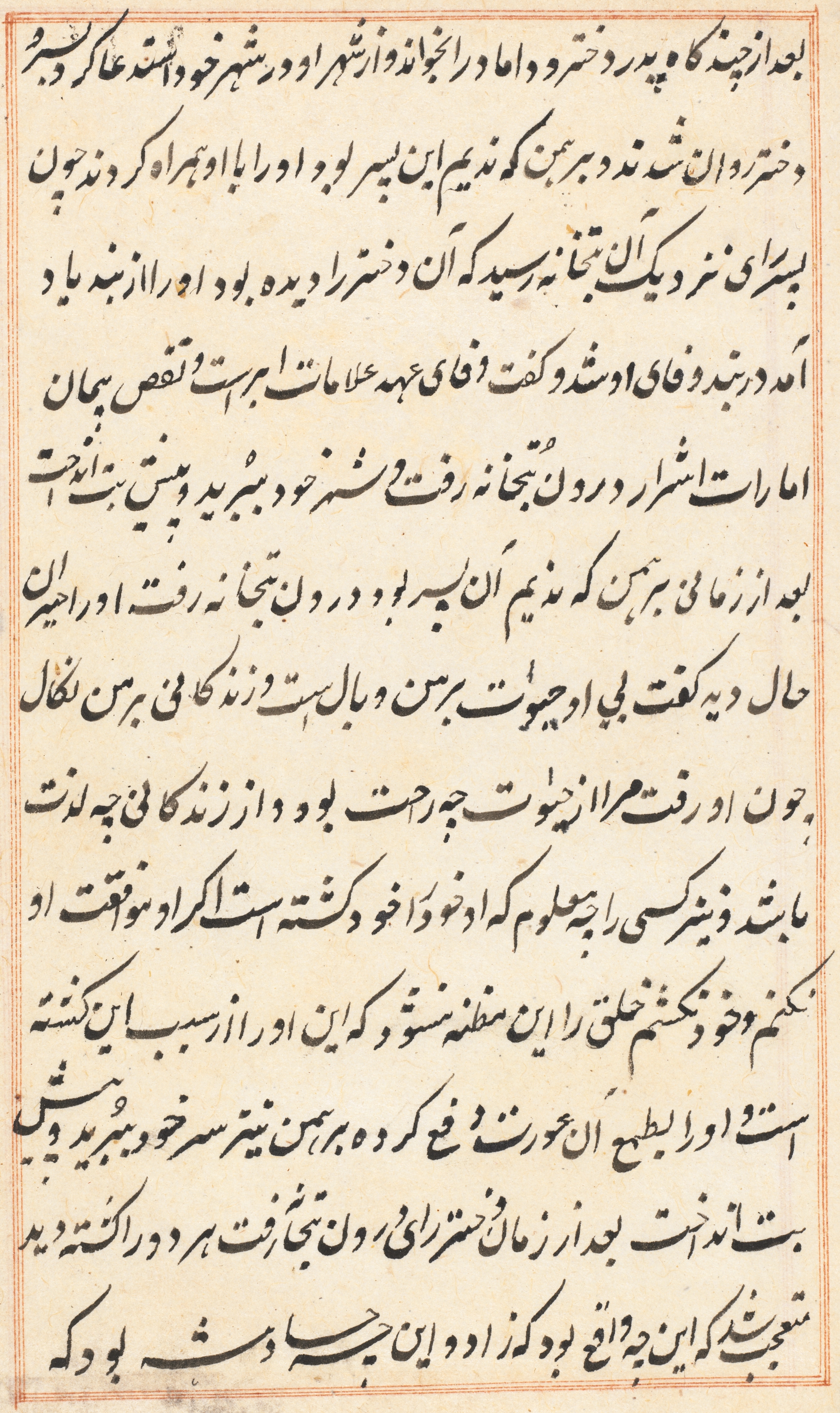 A page of text written in a black ink script on off-white paper. The text is written in a non-Latin script, likely Arabic or Persian. There are 33 lines of text. The page has a thin orange border. The background is off-white with yellow and brown spots.