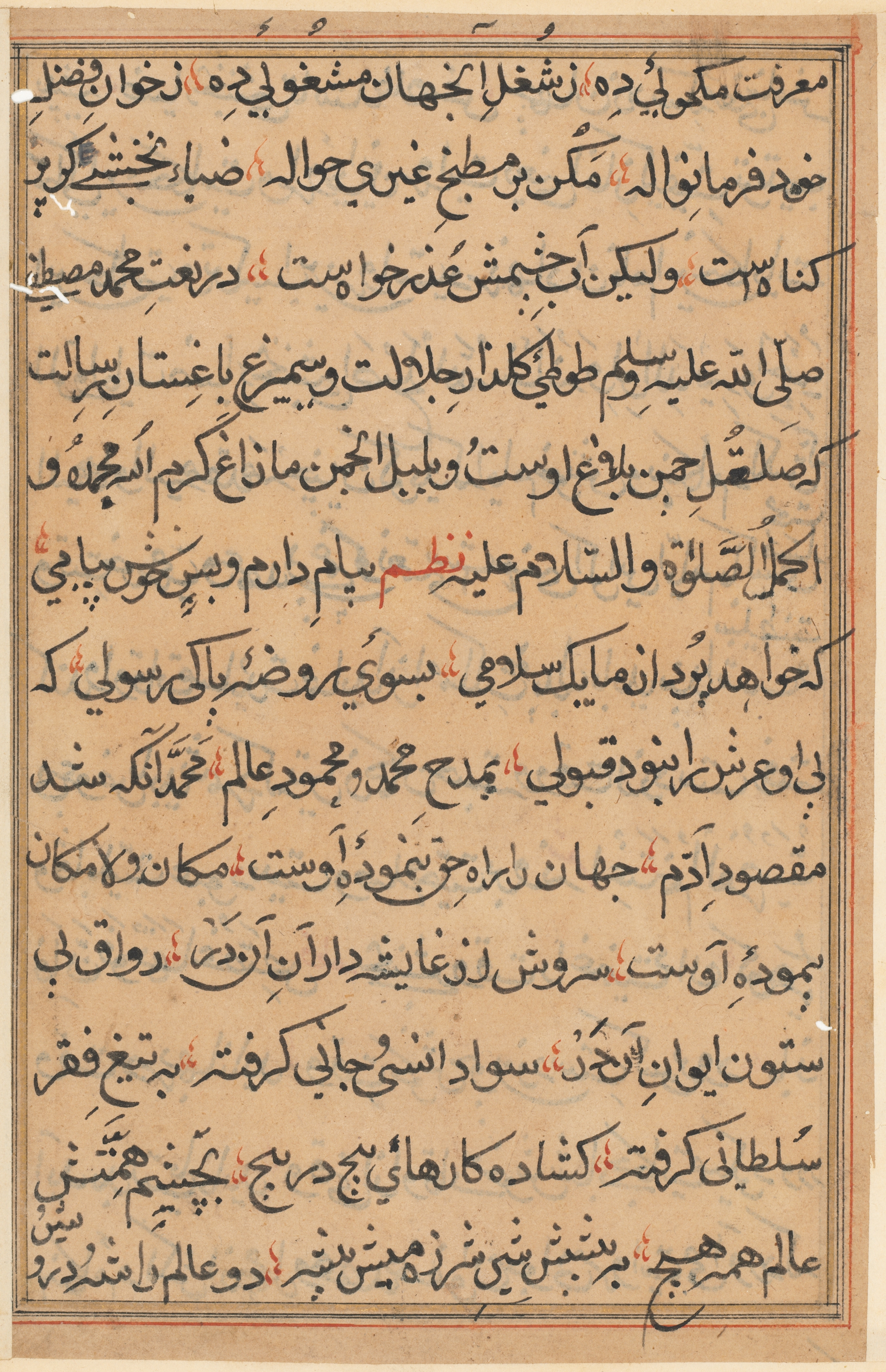 Tan-colored page with black, red, and blue ink. The page is filled with text written in Arabic calligraphy. A double border of thin lines in red and black surrounds the text. The text is arranged in lines from top to bottom. The lines are not perfectly straight. Some letters are written in red and blue ink. The background of the page has some darker tan spots.