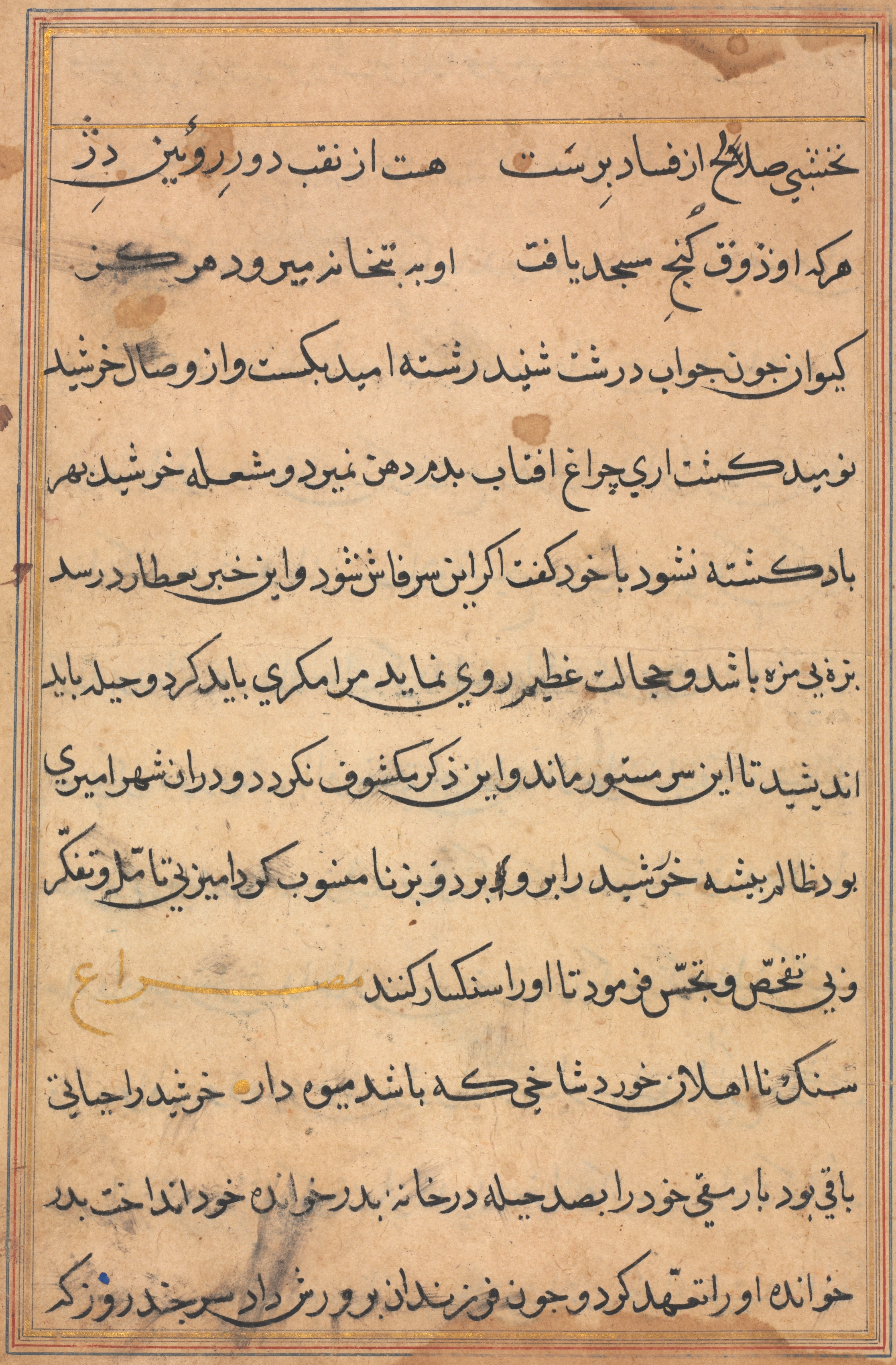 Page from Tales of a Parrot (Tuti-nama): text page. The image shows a page of handwritten text in a language that appears to be Persian or Arabic script. The page is yellowed with age and has a brown border around the edges. The text is written in black ink, with some words or phrases underlined or highlighted in gold ink. The handwriting is intricate and ornate, with flourishes and decorations throughout. There are no images or illustrations on the page, only text. The page appears to be from an old manuscript or book. The text fills the entire page, with little to no empty space. The border around the page is double-lined, with a thin line inside a thicker one. The corners of the page are slightly worn and damaged.