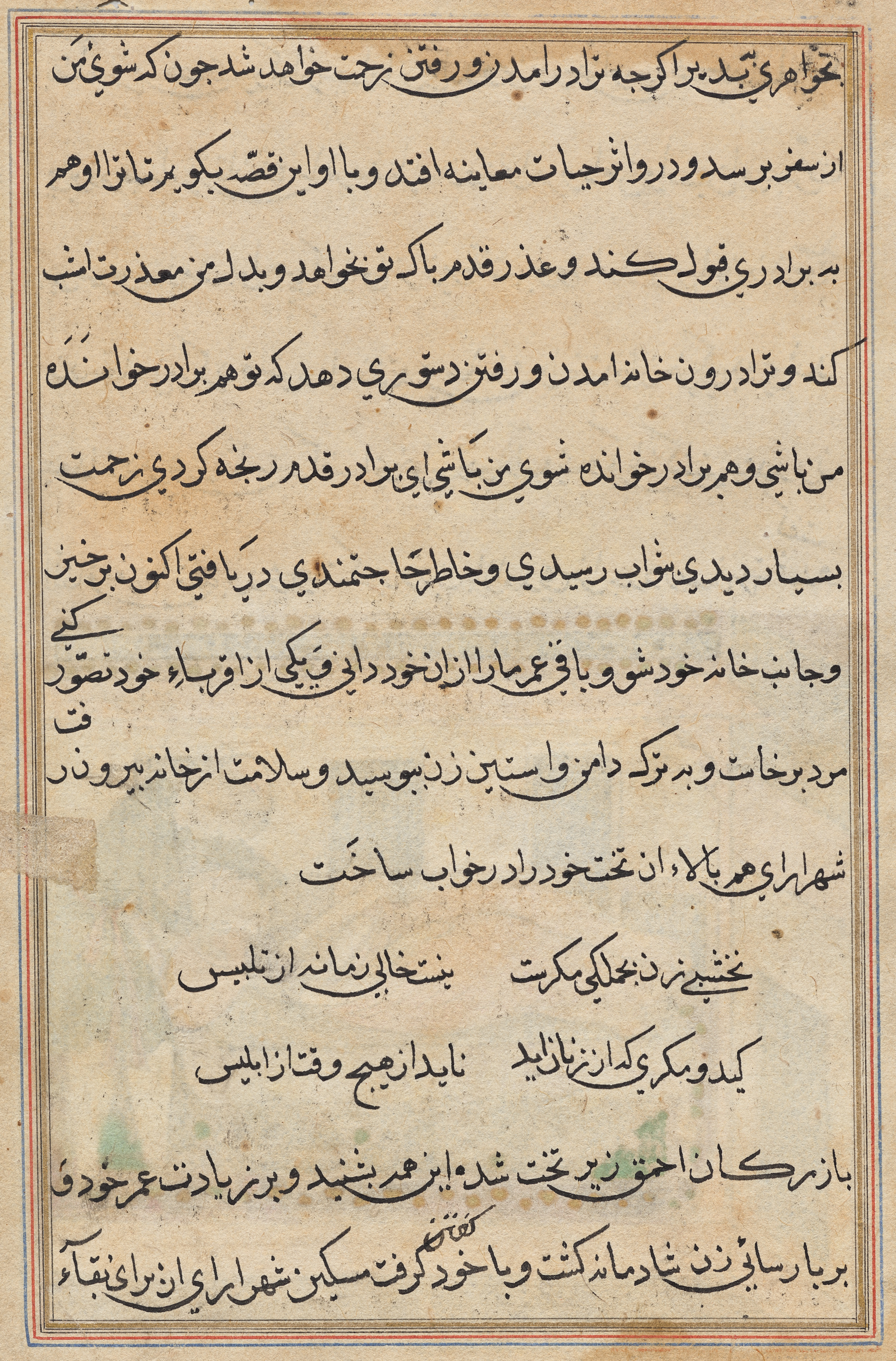 A page from a book written in an old language, likely Arabic script. The page is yellowed with age and has a border around the edges. The text is written in black ink and appears to be in a formal or calligraphic style. The text takes up most of the page, with no images or illustrations. The border is thin and consists of multiple lines of red, blue, and yellow. A piece of tape is on the left side. The background of the page is a light brown color with some darker brown spots and discoloration.