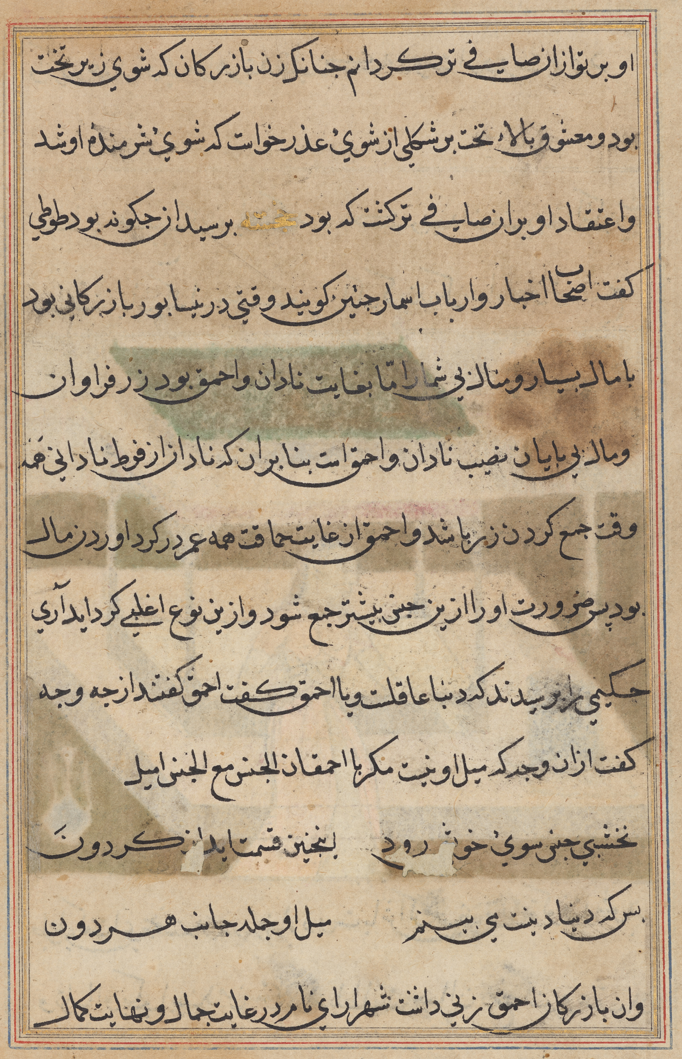 A page of writing in black ink on yellowed paper. The text is written in a language that appears to be Arabic script. The text fills the entire page, with no images or illustrations. A thin red and blue border outlines the page. A translucent white stain is visible in the center and lower right of the page. A darker brown stain is near the bottom. The edges of the page are rough and worn.