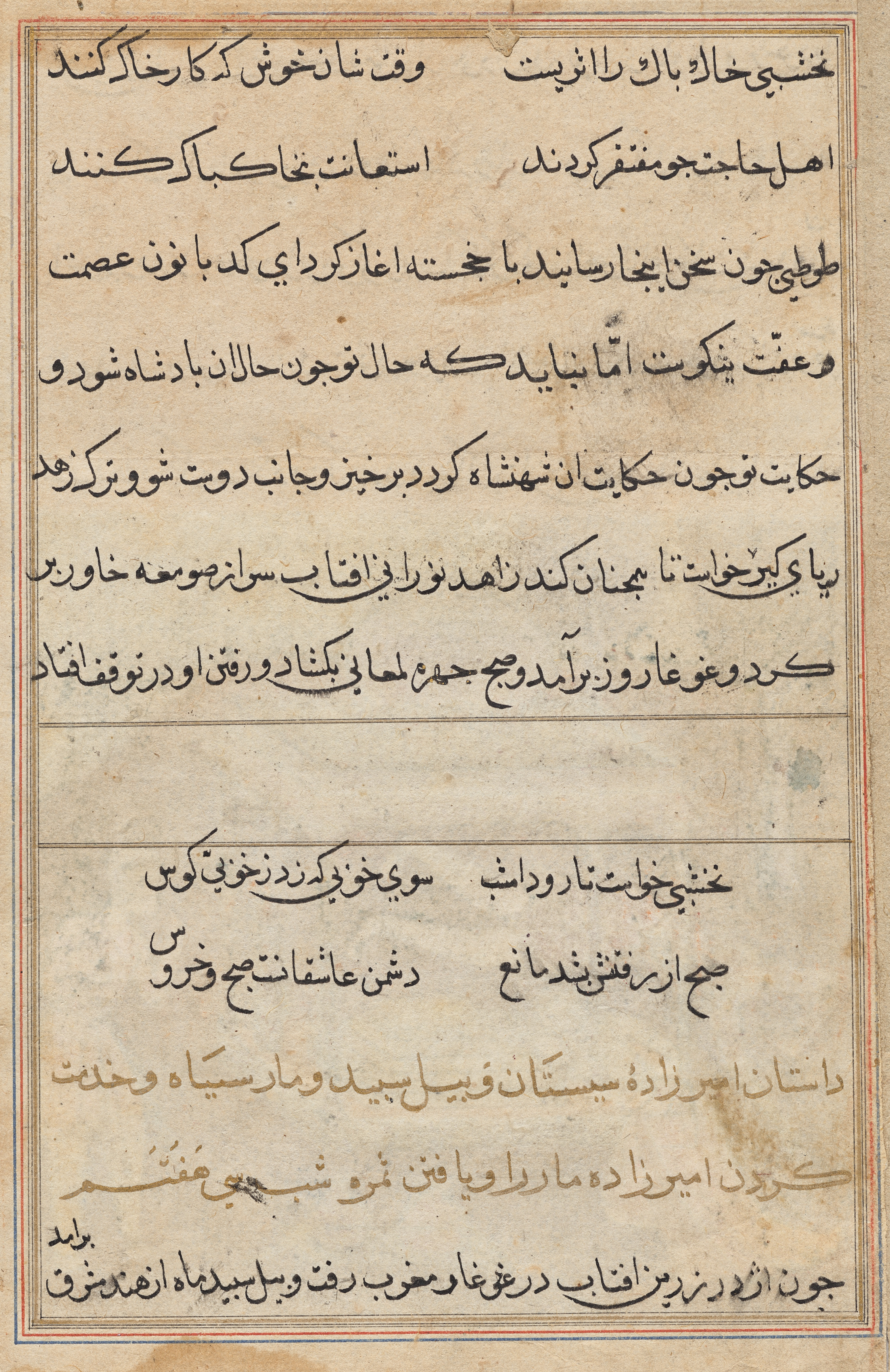 Tan parchment-colored page with dark brown text written in black ink. Text appears to be written in a language that reads right to left. Two columns of text; one at the top with 13 lines and one on the bottom with 8 lines. A thin red line borders the entire rectangle. A thicker red line divides the top and bottom sections.