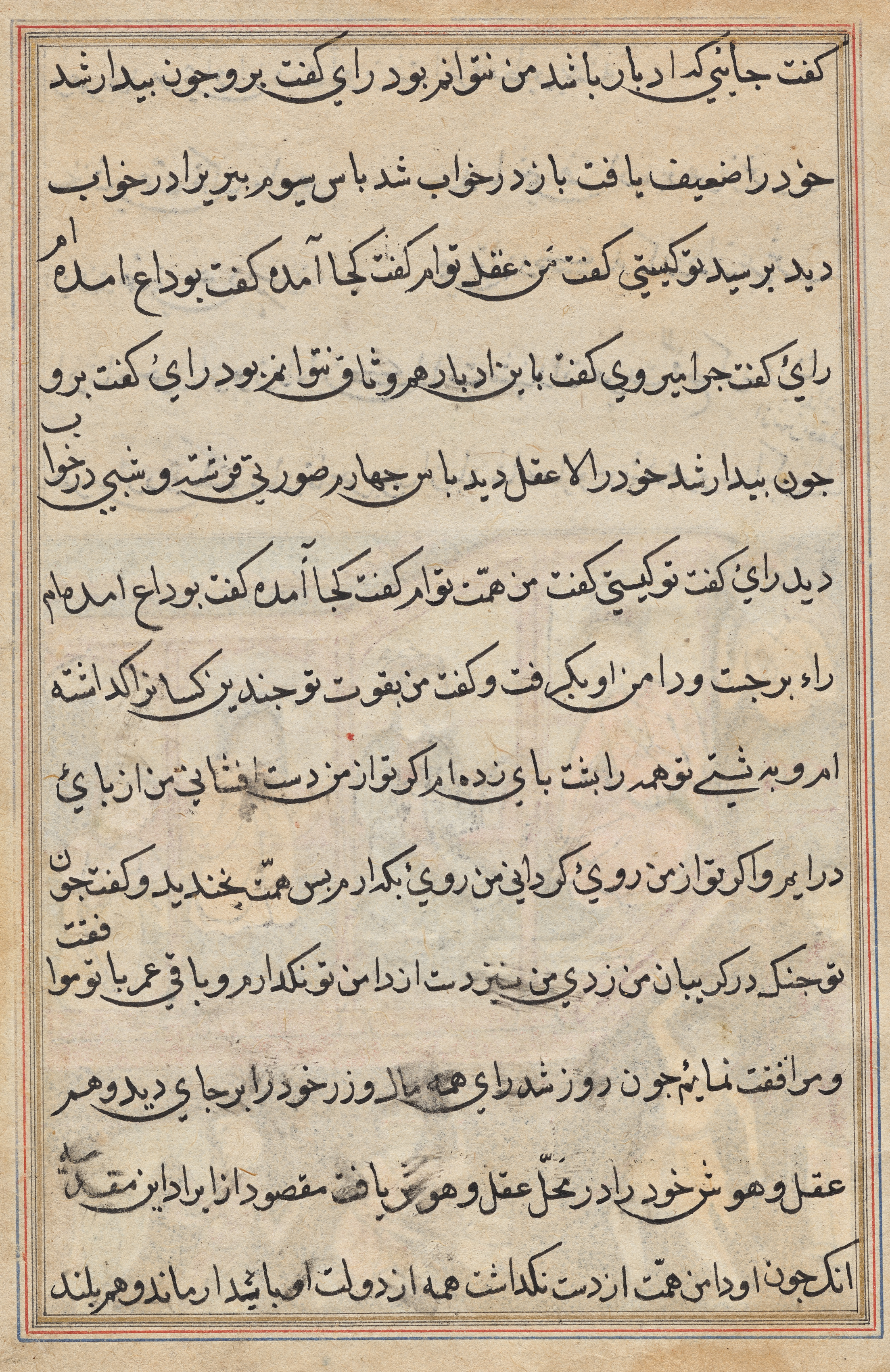 A page from a book with a beige background and a thin border. The border has a red line on the inside and outside. The border is on all four sides. The text is in a language that reads from right to left. The text is in black ink. The text fills most of the page, only leaving a small border around the edges. The artist and title is "Tales of a Parrot (Tuti-nama): text page".