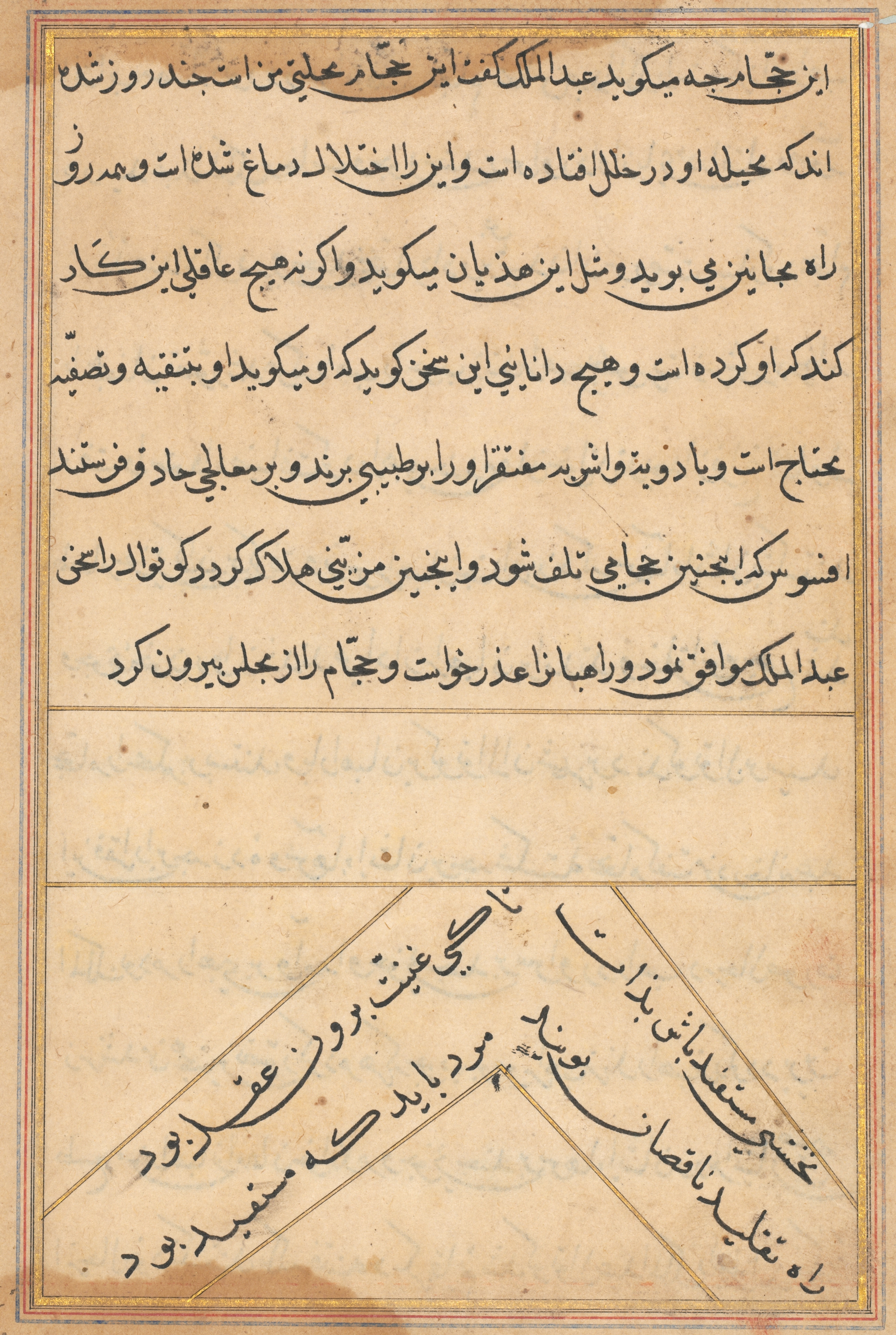 A yellowed, aged manuscript page with a thin double border and thicker inner and outer borders. The top section contains dense text written in black calligraphy in a language that appears to be Arabic or Persian script on a light brown background with darker brown spots. The bottom section features similar writing but is less dense. A geometric design with intersecting lines and text in black calligraphy overlays the lower right corner. The overall appearance suggests an ancient or historical document. Tuti-nama.