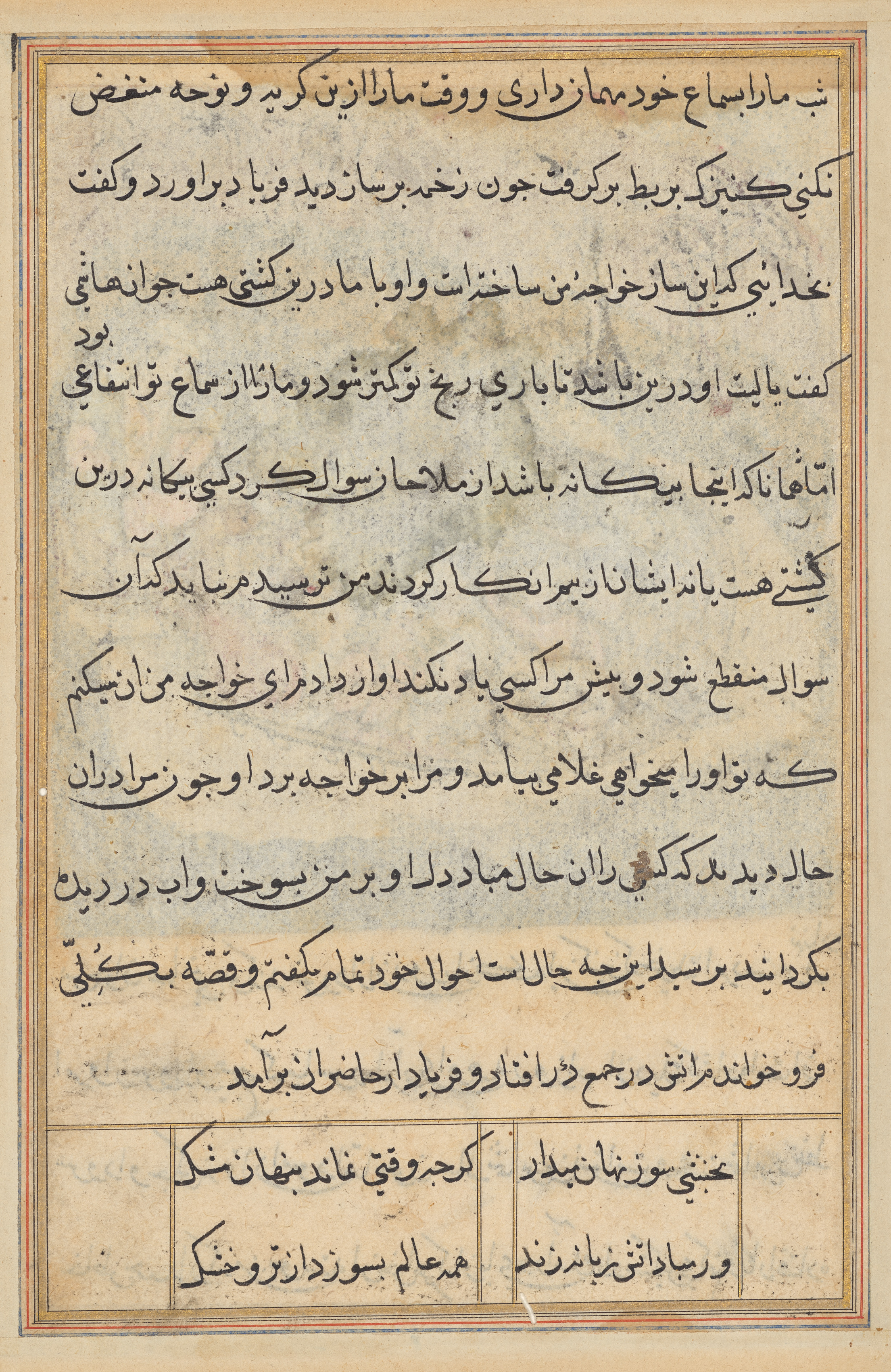 The image shows a page from "Tales of a Parrot (Tuti-nama)" by an unknown artist. The page is filled with black text written in a foreign language, possibly Arabic or Persian, and is surrounded by a thin border with a red and blue outline. The text is arranged in paragraphs, with some sections separated by thin lines. The background of the page is a light brown color, with some darker brown spots and discoloration visible throughout. There are two rectangular text boxes at the bottom of the page, each containing a few lines of text. The overall appearance of the page suggests that it is an old, possibly hand-written manuscript.