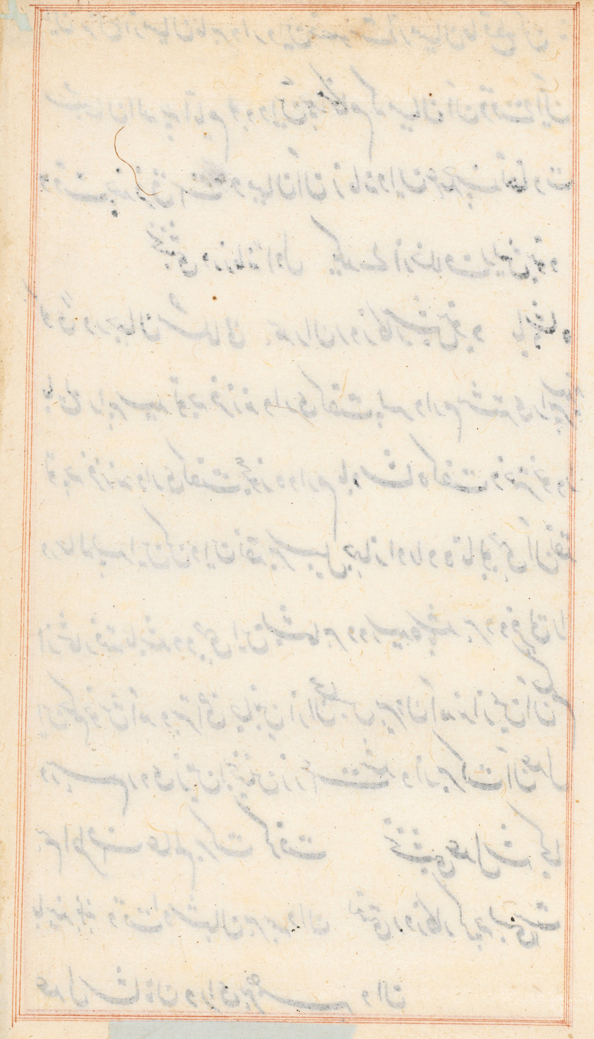 The image shows a page from a book titled "Tales of a Parrot (Tuti-nama)" by an unknown artist. The page is off-white with a thin red border around the edges. The text on the page is written in blue ink and appears to be in Arabic script. The text is arranged in lines that run horizontally across the page. The lines of text are not filled in, and the page appears to be blank except for the text. There are some darker spots and discoloration on the page, suggesting age. The background behind the page is white.