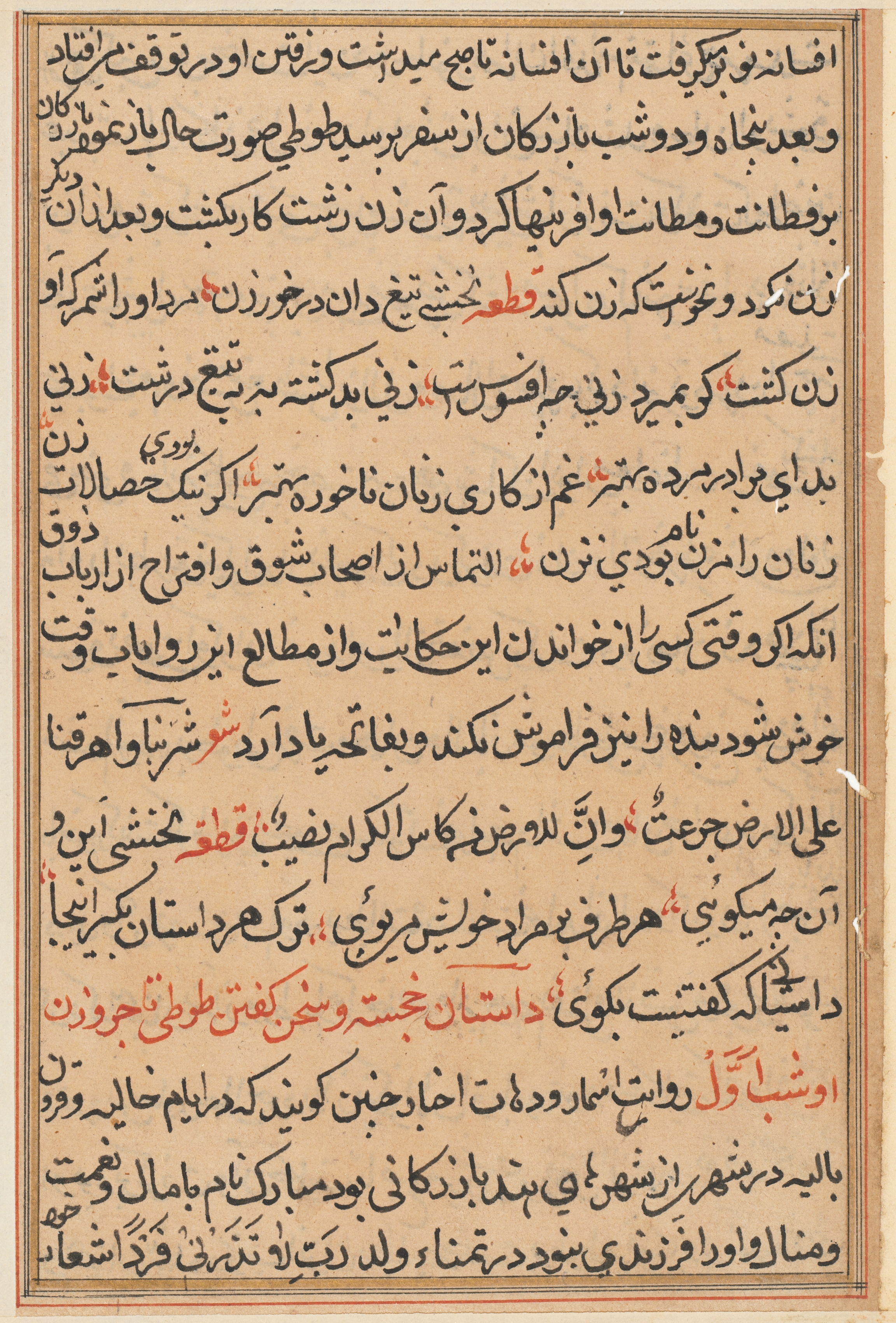 Tan-colored page with black, red, and brown text written in a foreign language, possibly Arabic script. Text fills most of the page in a single column. A thin brown border surrounds the page with thicker brown lines separating the text into sections and marking the edges. Red highlights are scattered throughout, drawing attention to certain parts of the text. A darker brown mark appears on the right side. The page shows signs of aging, with small tears and discoloration. The artist and title of the work, "Page from Tales of a Parrot (Tuti-nama): text page," are associated with this image.