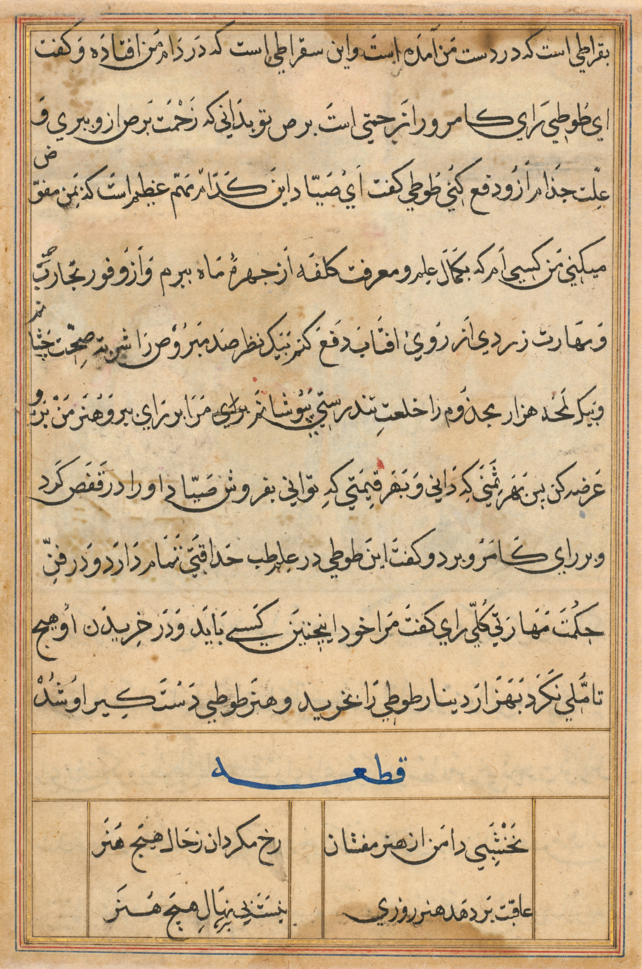 A page of writing in a book. The writing is in Arabic script and appears to be black ink on beige-colored paper. There are two thin red lines around the edge of the paper, one close to the edge and one about one centimeter in. There are several lines of text, each one written horizontally across the page. The text is written in a flowing script with some decorations. There are some small marks and stains on the page. At the bottom of the page, there are two rectangular sections of text, one on the left and one on the right, separated by a blue curved line. The text in the rectangles appears to be the same script. The overall appearance of the page suggests it is an old manuscript.