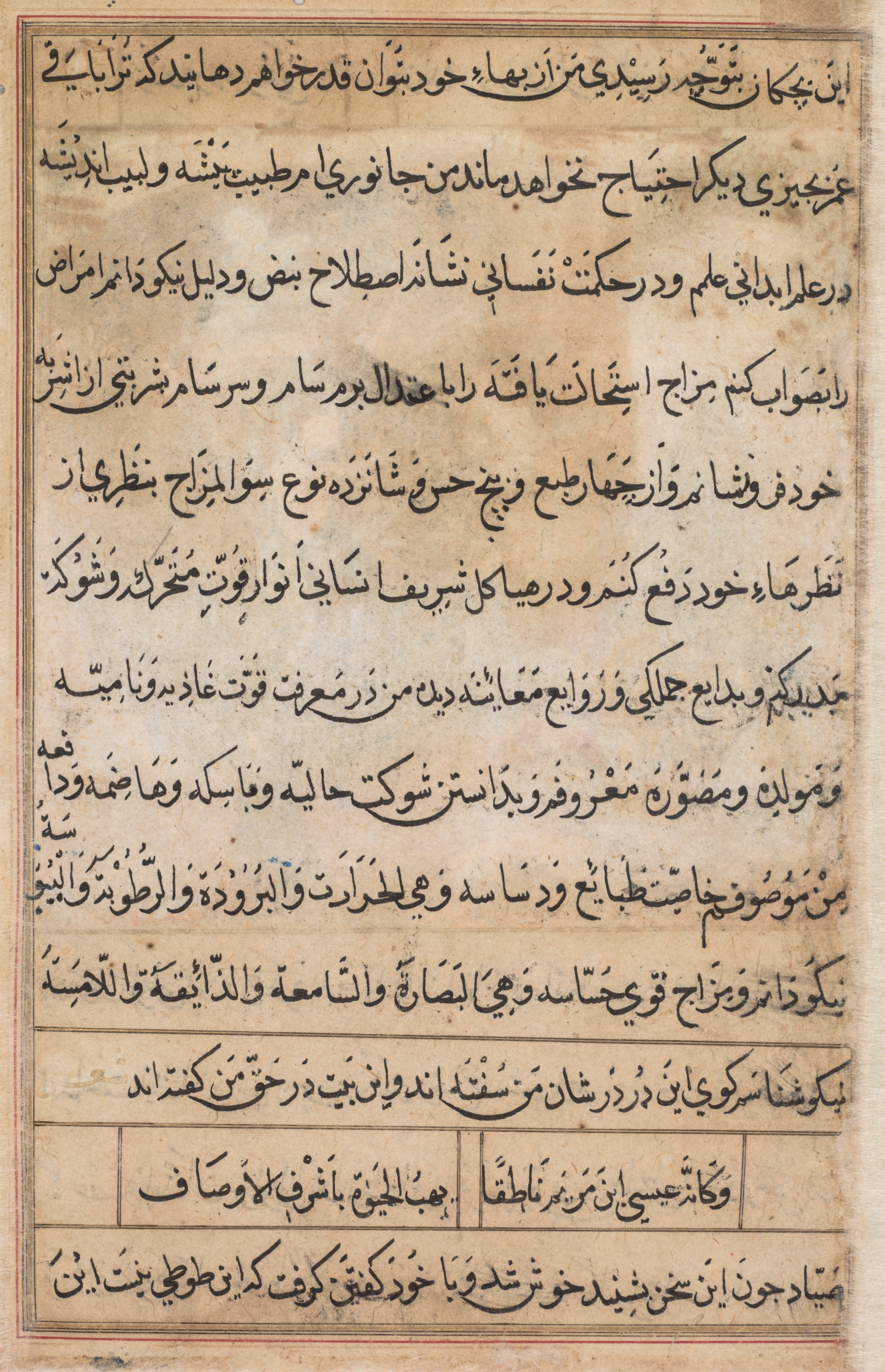 Brown parchment with black ink writing in Arabic script. Text fills most of the page in several blocks of writing. The text is in a single column. A thin red line borders the page on the left and right sides. A thicker red line borders the top and bottom. A horizontal line separates sections of text at the bottom. The background has a texture similar to aged paper.