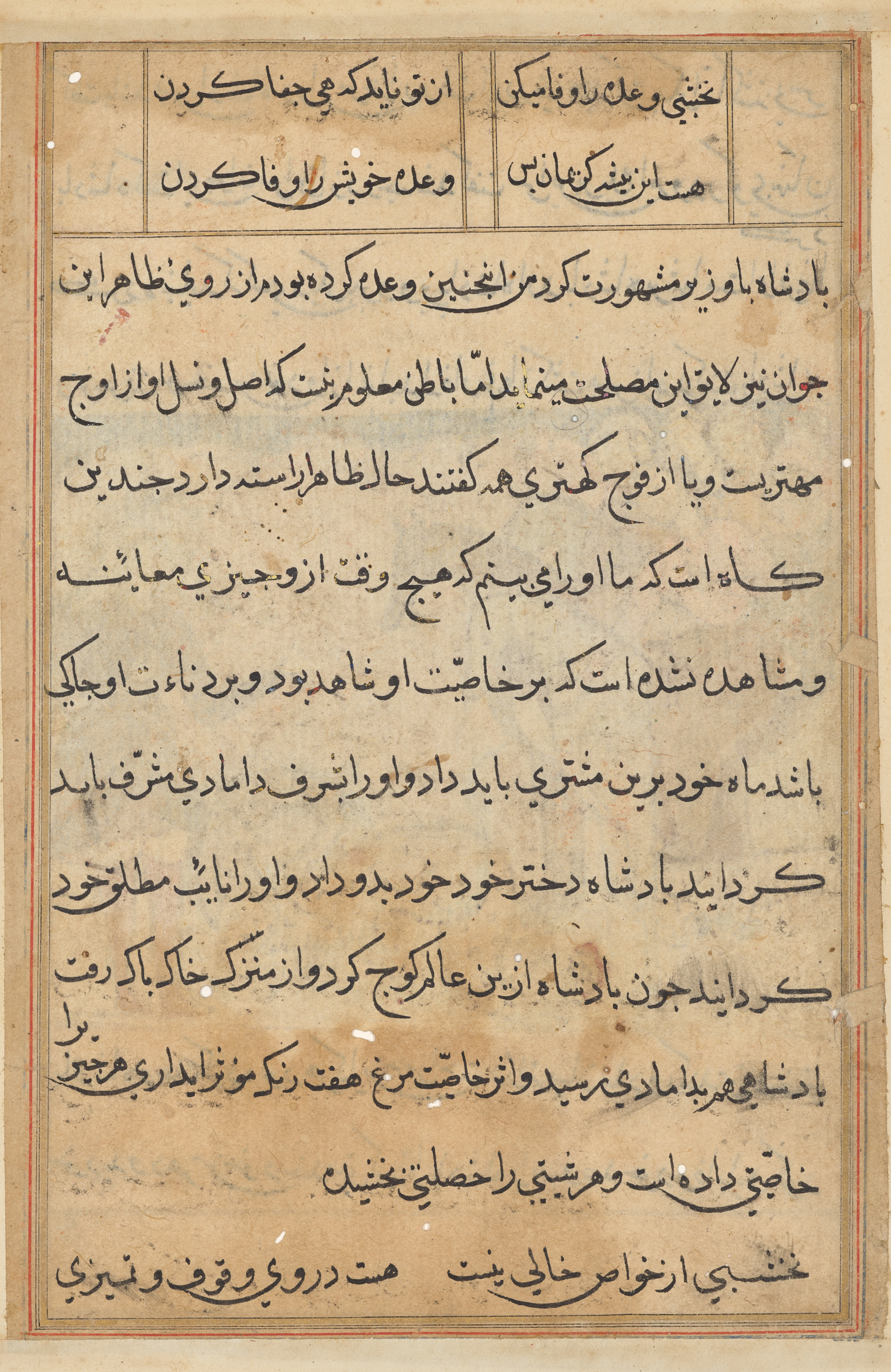 A page of written text in a book titled "Page from Tales of a Parrot (Tuti-nama): text page" by an unknown artist. The page features a central body of text in a language that appears to be Arabic or Persian script. The text fills the majority of the page and is arranged in lines that run from right to left. A red border on the right and bottom edges of the page frames the text. A three-sectioned box appears at the top of the page and contains the same text. The background of the page exhibits signs of age.