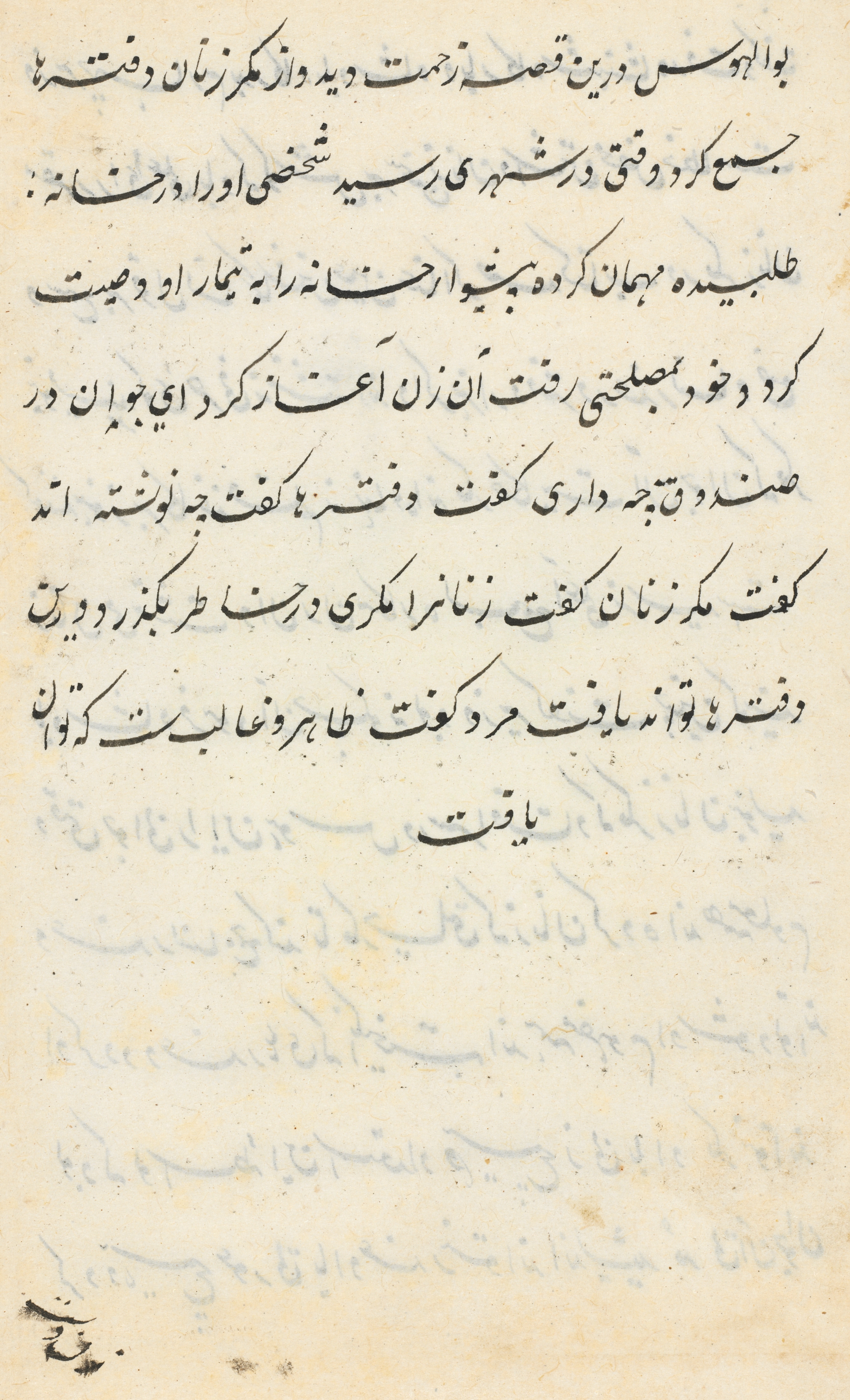 Tan, aged paper with darker tan and brown spots, stains and darker edges. Black text written in a foreign script in 22 lines. Faded, light blue text on bottom half of the page.