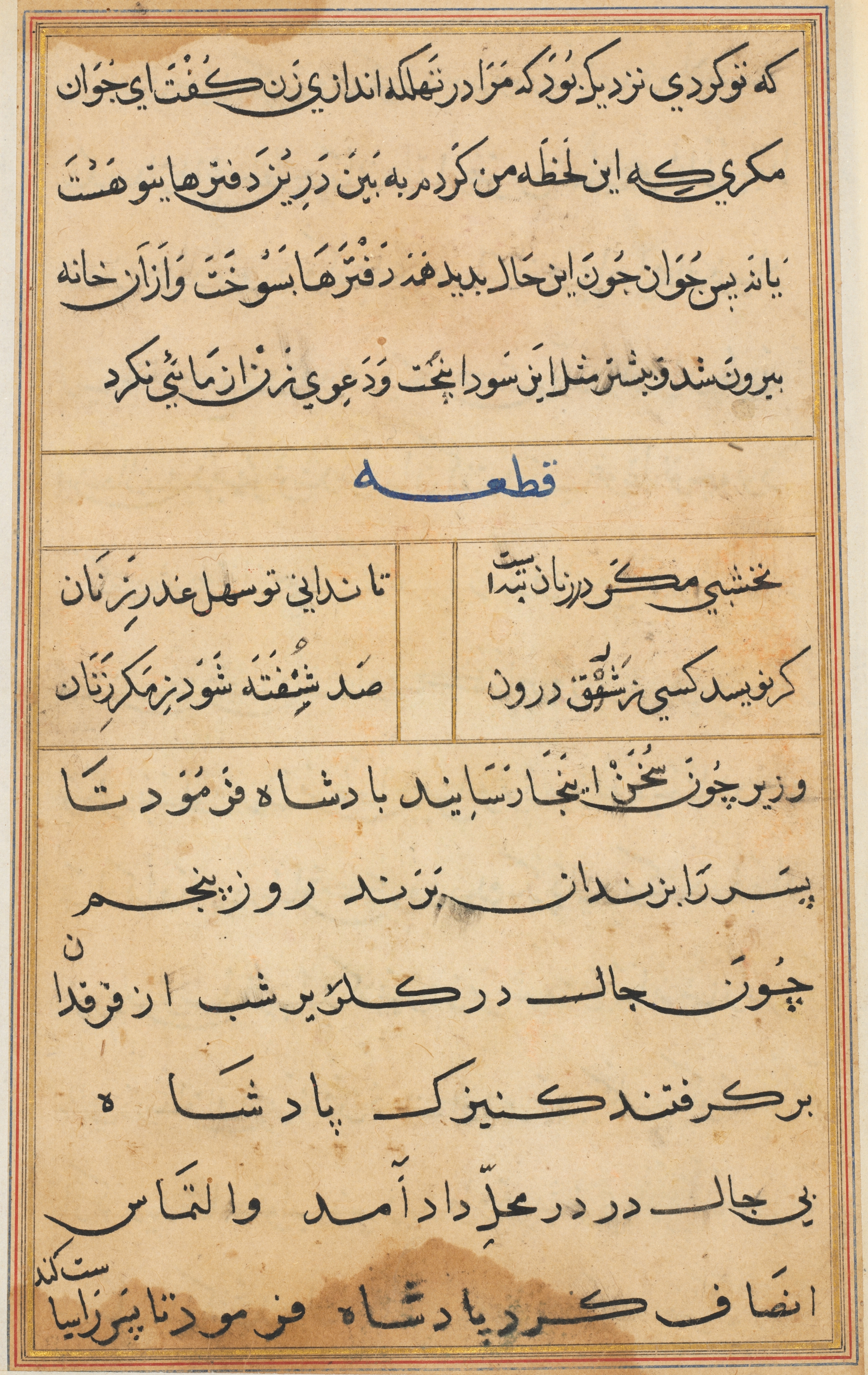 The image shows a yellowed, aged page with black text written in a non-Latin script, likely Arabic or Persian. The page has a thin red border around the edges and a thicker red line separating the sections of text. The text is arranged in several paragraphs, with some sections separated by thin black lines. A larger blue line separates one section from another. The page appears to be old and worn, with brown spots and discoloration visible. The text appears to be from "Tales of a Parrot (Tuti-nama)".