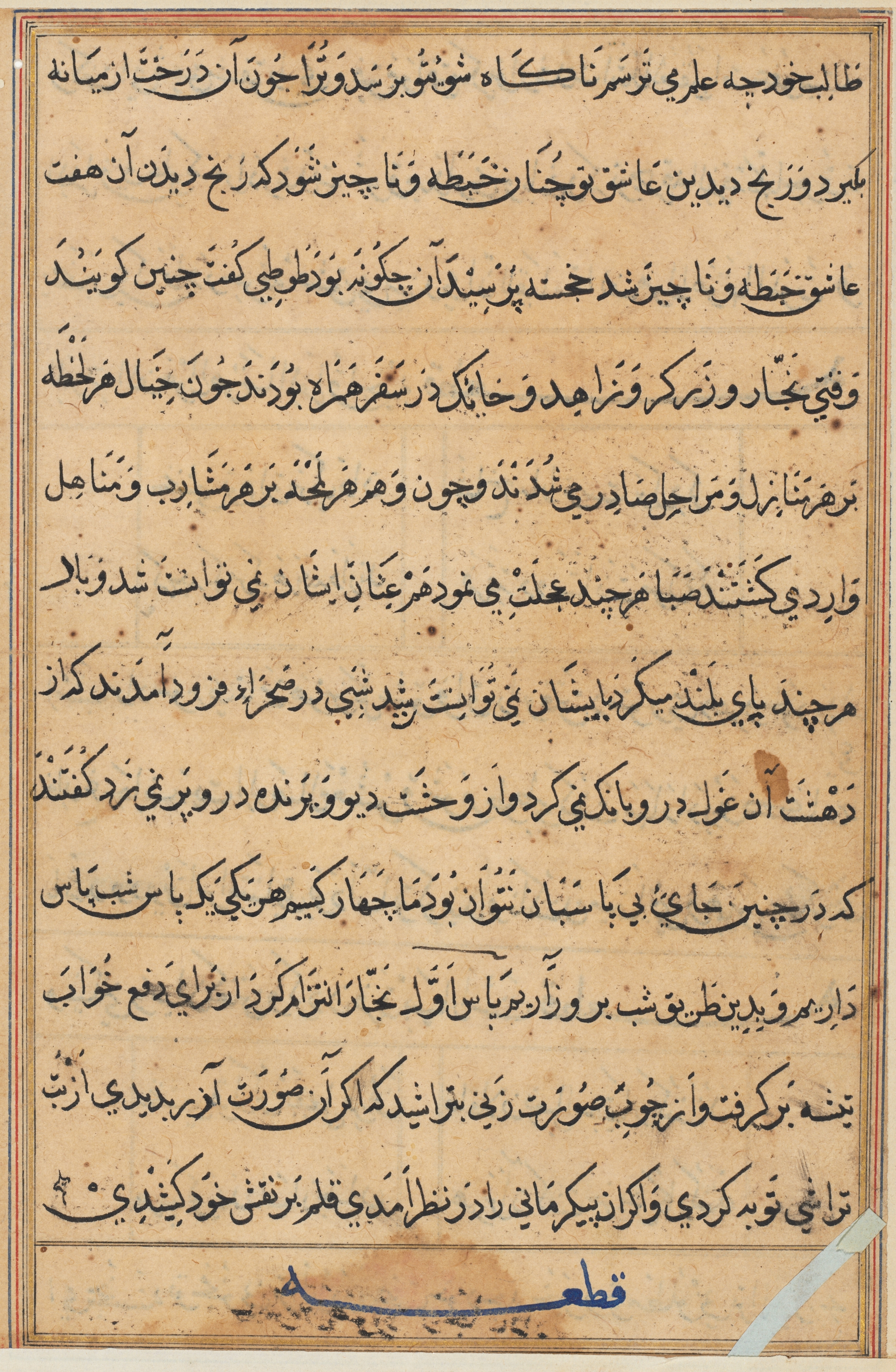 The image shows a yellowed, aged manuscript page. The page is filled with black text written in a language that appears to be Arabic script, likely Persian. The text is arranged in lines that run from right to left. A thin, double-lined border frames the page. A small section of blue text appears in the bottom-right corner. A piece of white tape is affixed to the bottom-right corner of the page. The background of the image is white.
