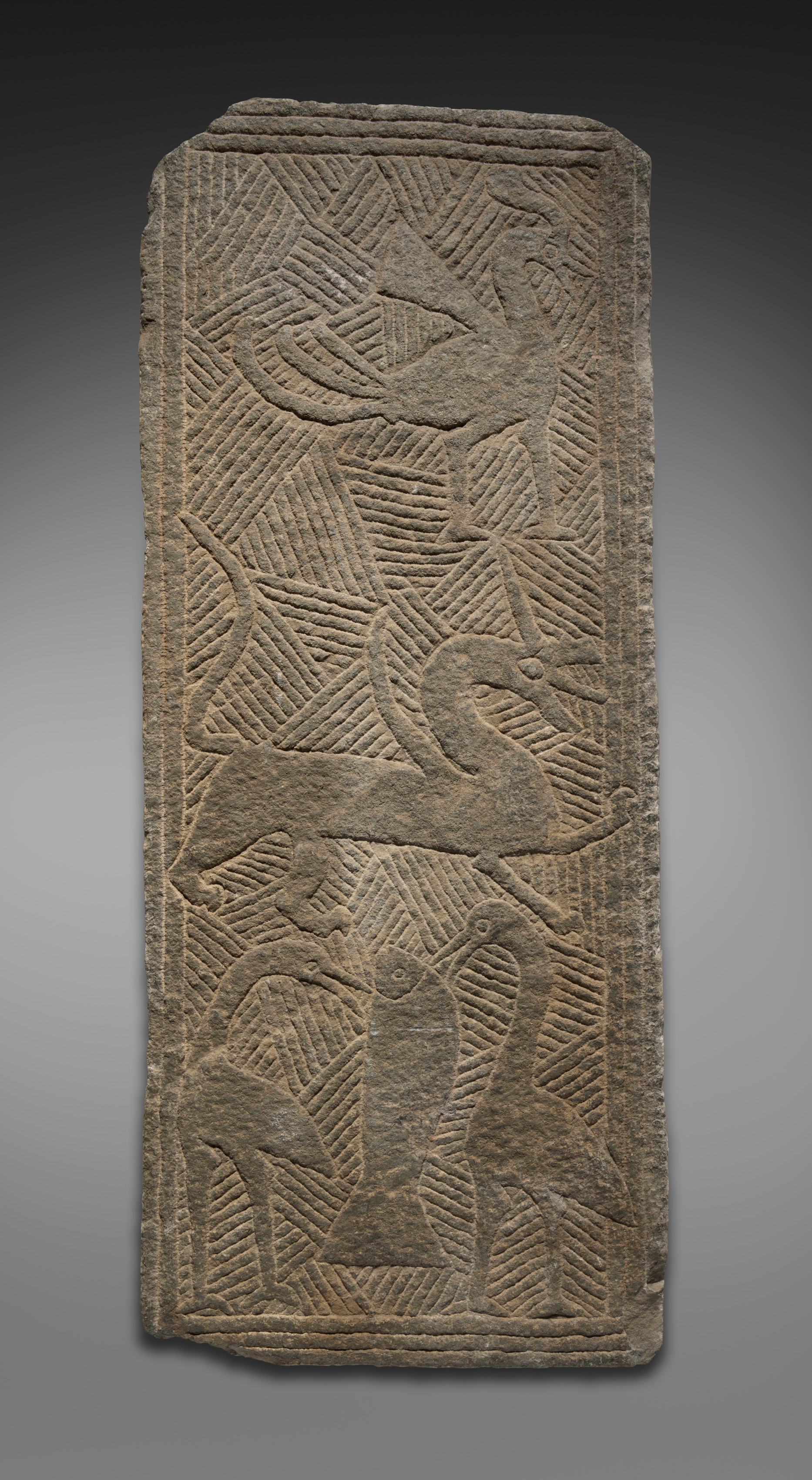 The relief depicts a rectangular stone carving with a flat top and rounded edges. The carving features three birds, each with a distinct design. The top bird faces right with its body curved and head turned to the right. The middle bird also faces right with its head down and beak pointed to the right. The bottom bird faces left with its head up and beak pointed to the left. The background of the carving consists of diagonal lines arranged in a pattern of intersecting lines and shapes. The carving has a border around the edges, with a thicker border on the left and right sides. The relief is titled "Relief" and is attributed to an unknown artist.