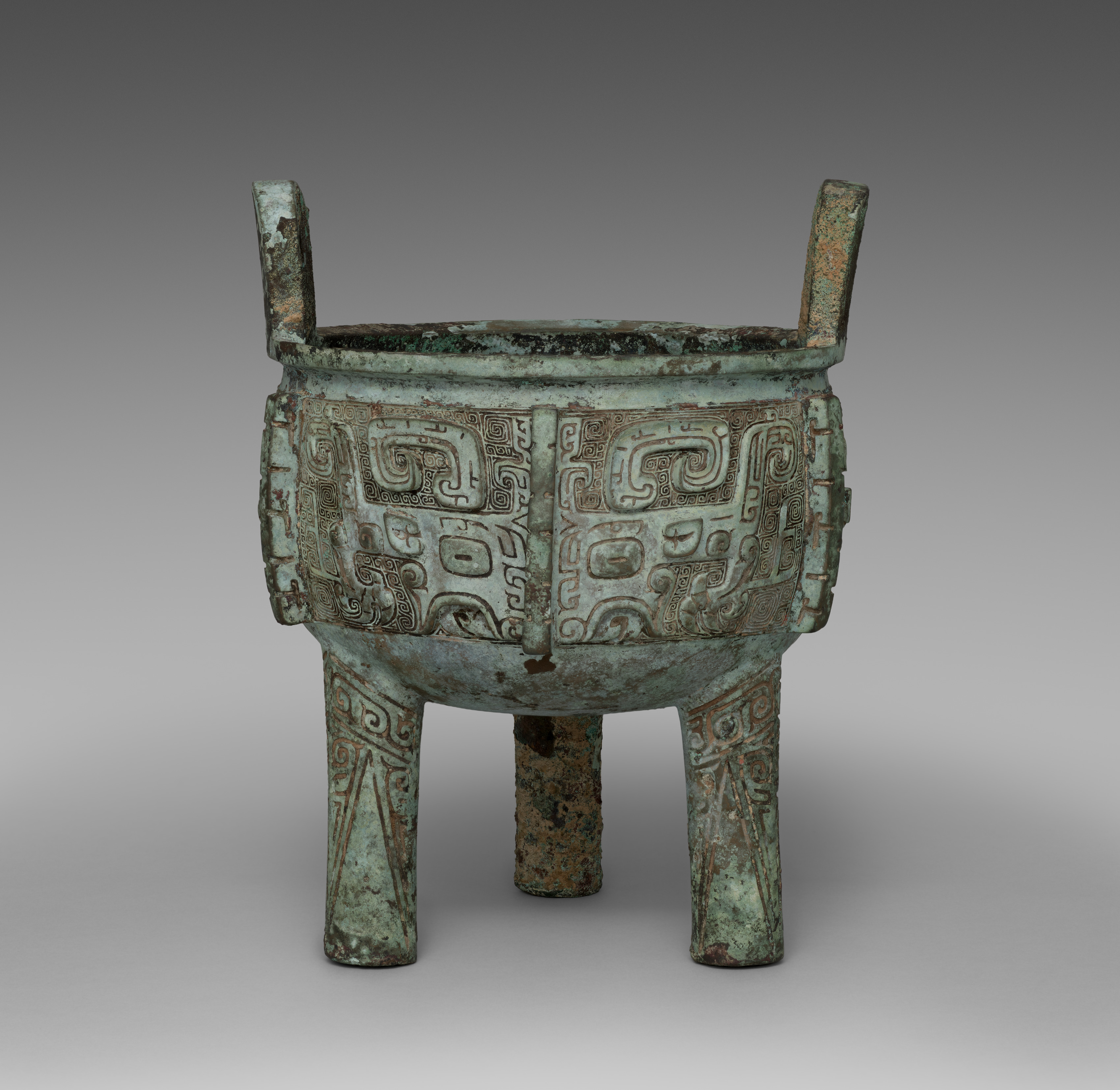 Greenish metal tripod vessel, Tripod (Ding), by unknown artist. The vessel has a wide, rounded body with a flat bottom and three legs. Two upright handles protrude from the rim. The body and legs are decorated with raised, geometric patterns. The surface is weathered and shows signs of aging. The background is a gradient gray.