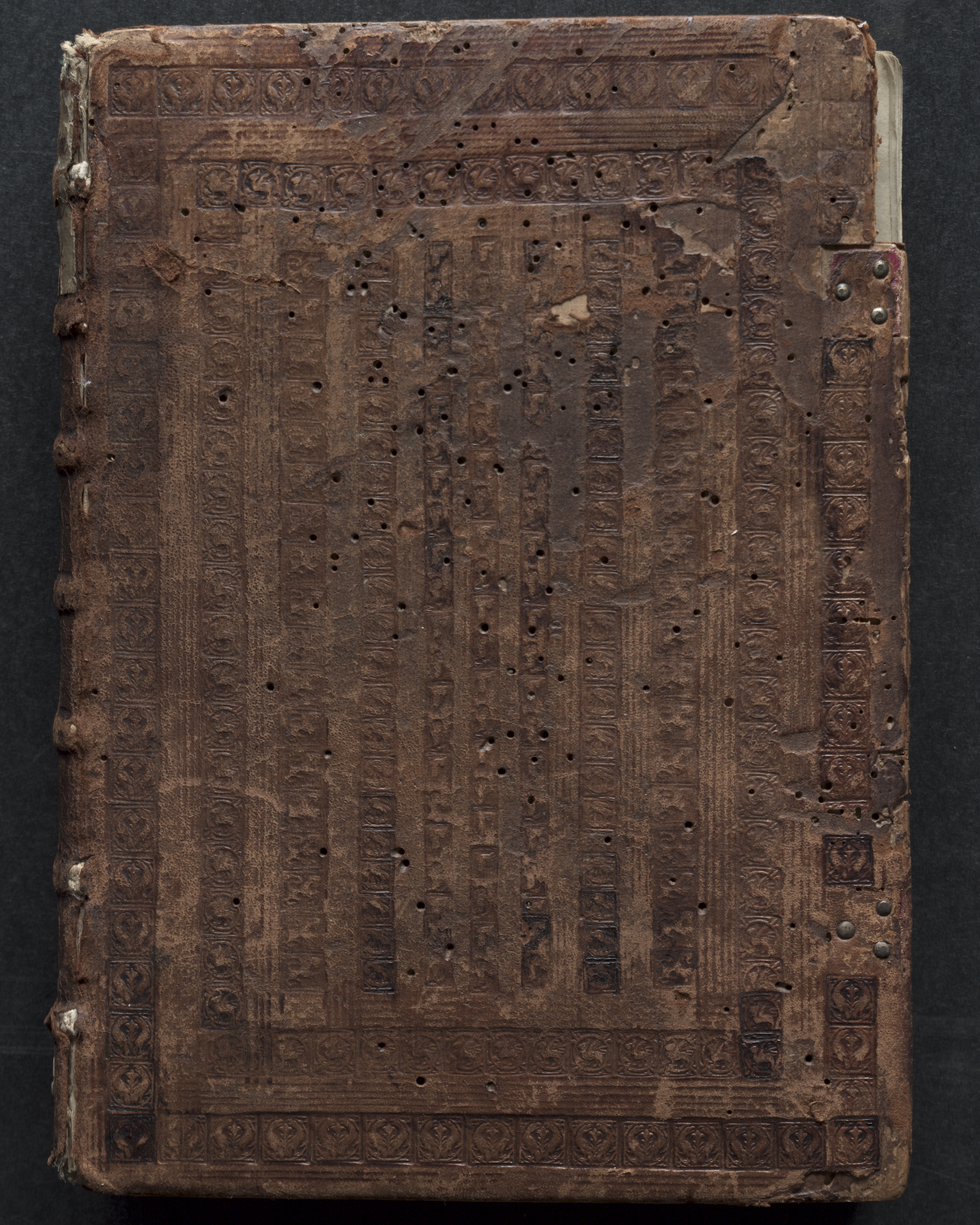 Brown leather book cover with embossed border and central panel, featuring a grid pattern with floral motifs and geometric shapes. The cover is worn, with visible signs of aging, including holes, tears, and discoloration. Small metal rivets are located on the right side. The background is dark gray. The Gotha Missal by Master of the Boqueteaux.