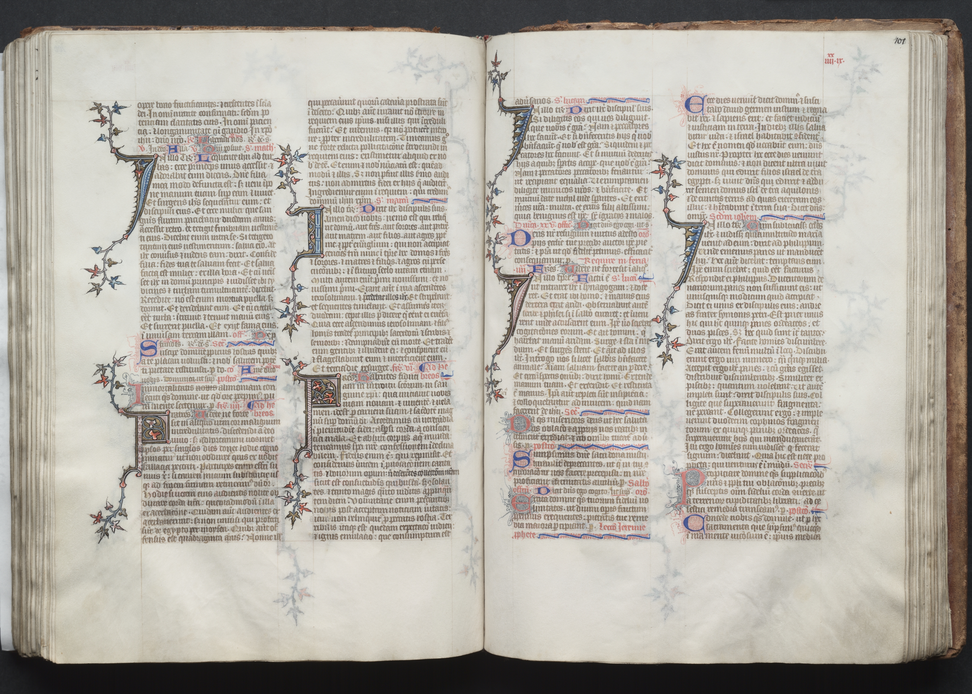 Open book with yellowed pages, featuring black text in a medieval script. The pages have decorative borders with blue, red, and black floral designs. The left and right pages each have three columns of text. The left page's column 2 and right page's column 3 have a large decorative initial letter at the top. The pages are slightly worn and have visible signs of aging. The book's cover is not visible, but the pages are set against a dark background.