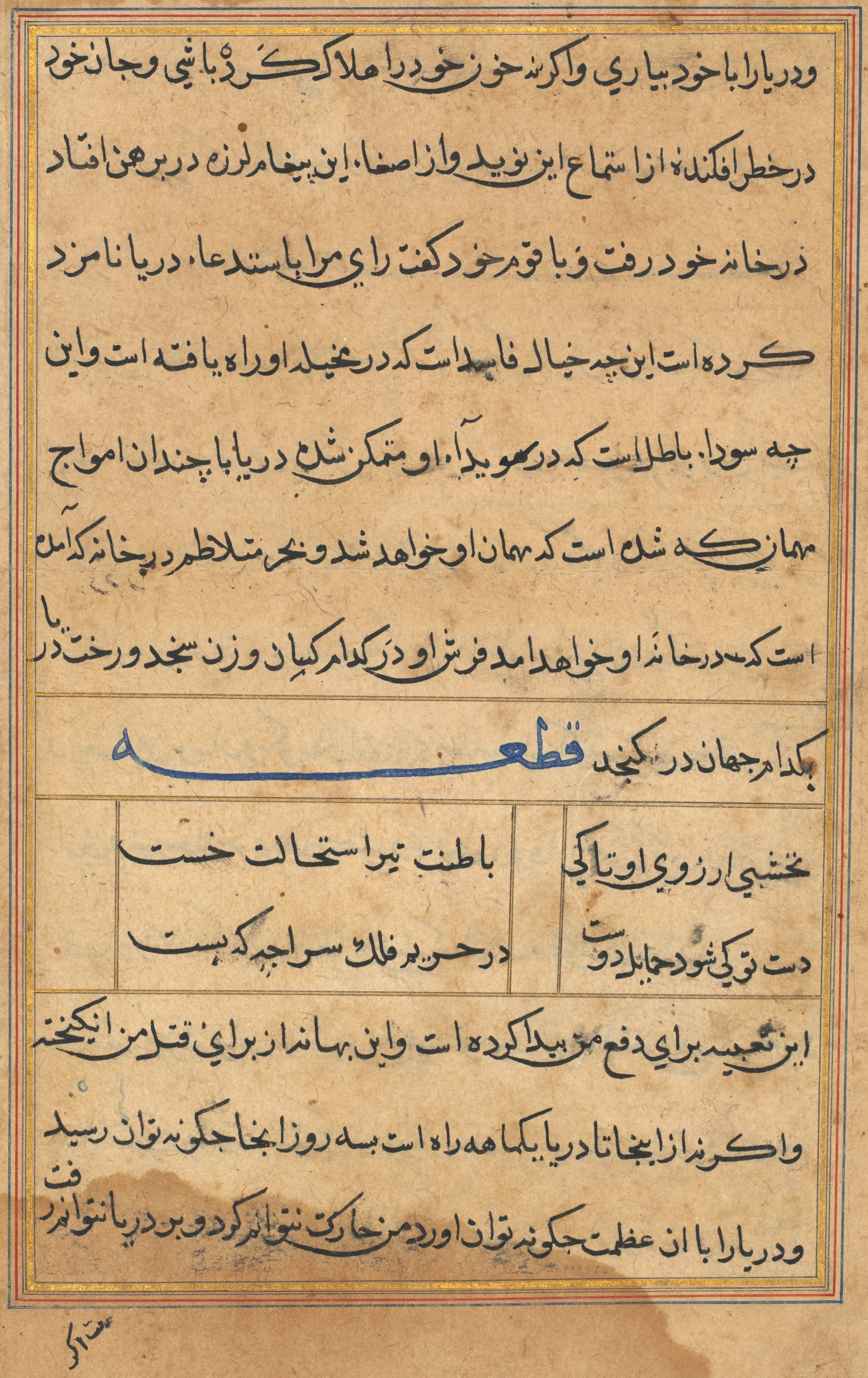 Brown page with black text written in a foreign language, possibly Arabic. The text is arranged in lines, with some lines thicker than others. A blue line separates sections of writing. A double-lined border surrounds the page. The bottom-left corner appears worn and discolored. A signature is present in the bottom-left corner.