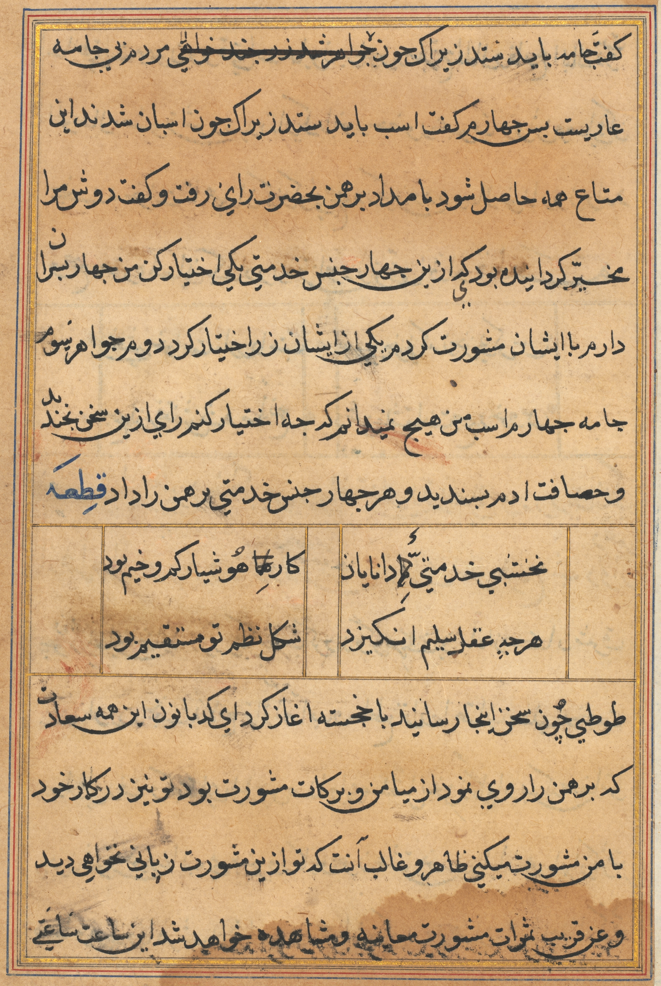 The image shows a page from the book "Tuti-Nama (Tales of a Parrot)" by an unknown artist. The page is filled with black and blue handwritten text in a language that appears to be Arabic or Persian script. The text lines are written horizontally, with multiple lines of text arranged in a column. The text fills the majority of the page, with a small border around the edges. The border consists of a thin line with a thicker line on the outside. The background of the page is a yellowed parchment color with darker edges. The page appears aged, with darker spots and discoloration throughout. Two rectangular sections of text are separated from the rest of the text by thin lines. The top section of the page contains approximately 25 lines of text. The bottom section contains approximately 11 lines of text. The text is written in calligraphy. The page does not contain any images or illustrations. The overall appearance suggests an ancient manuscript.