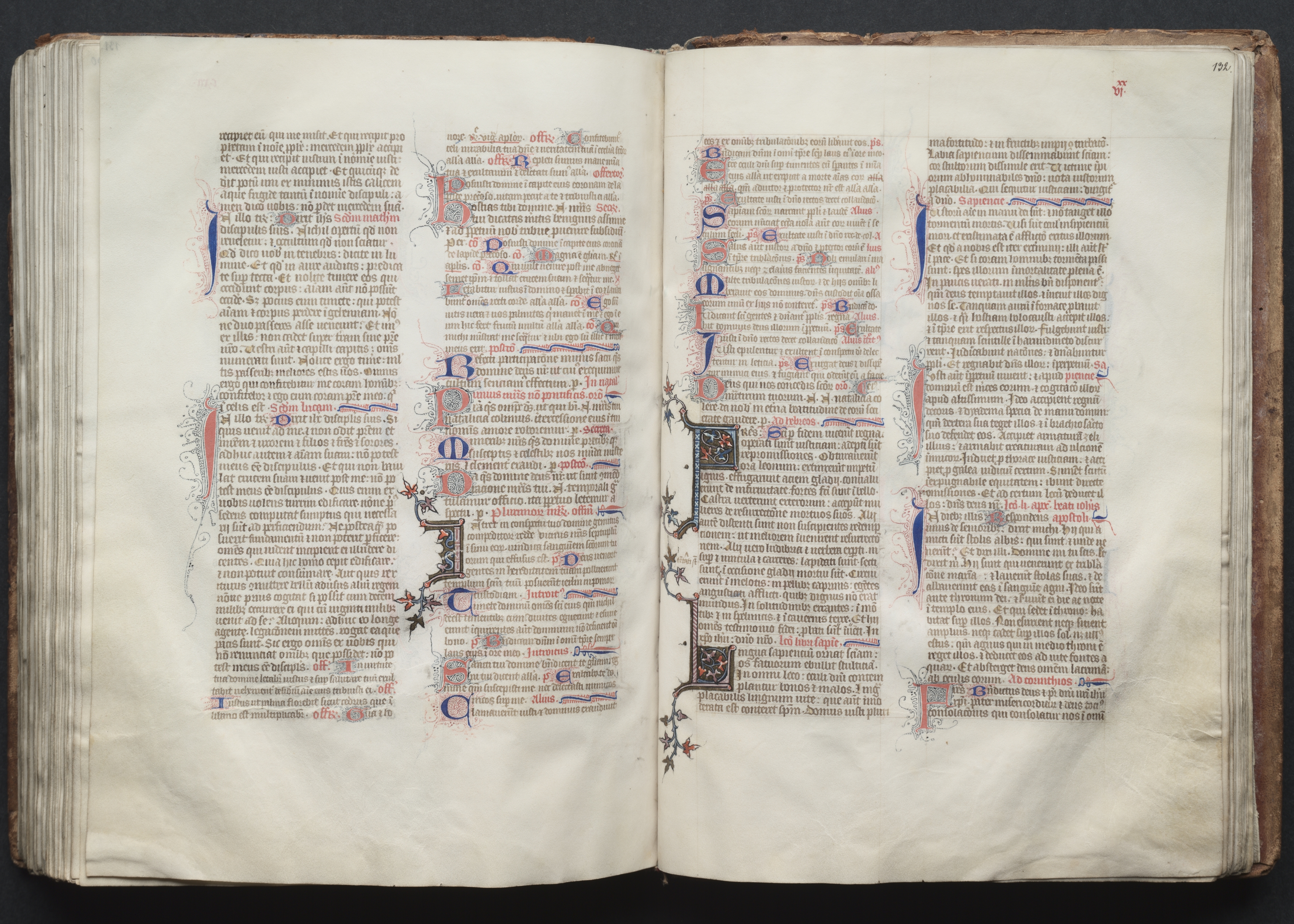An open book with yellowed pages displays black text in a medieval style. The pages are numbered 131 and 132 in the upper right-hand corner. The text is organized into columns and features illuminated letters. The pages exhibit signs of aging and wear, including discoloration and small tears. A brown border surrounds the pages. The book is set against a dark background.