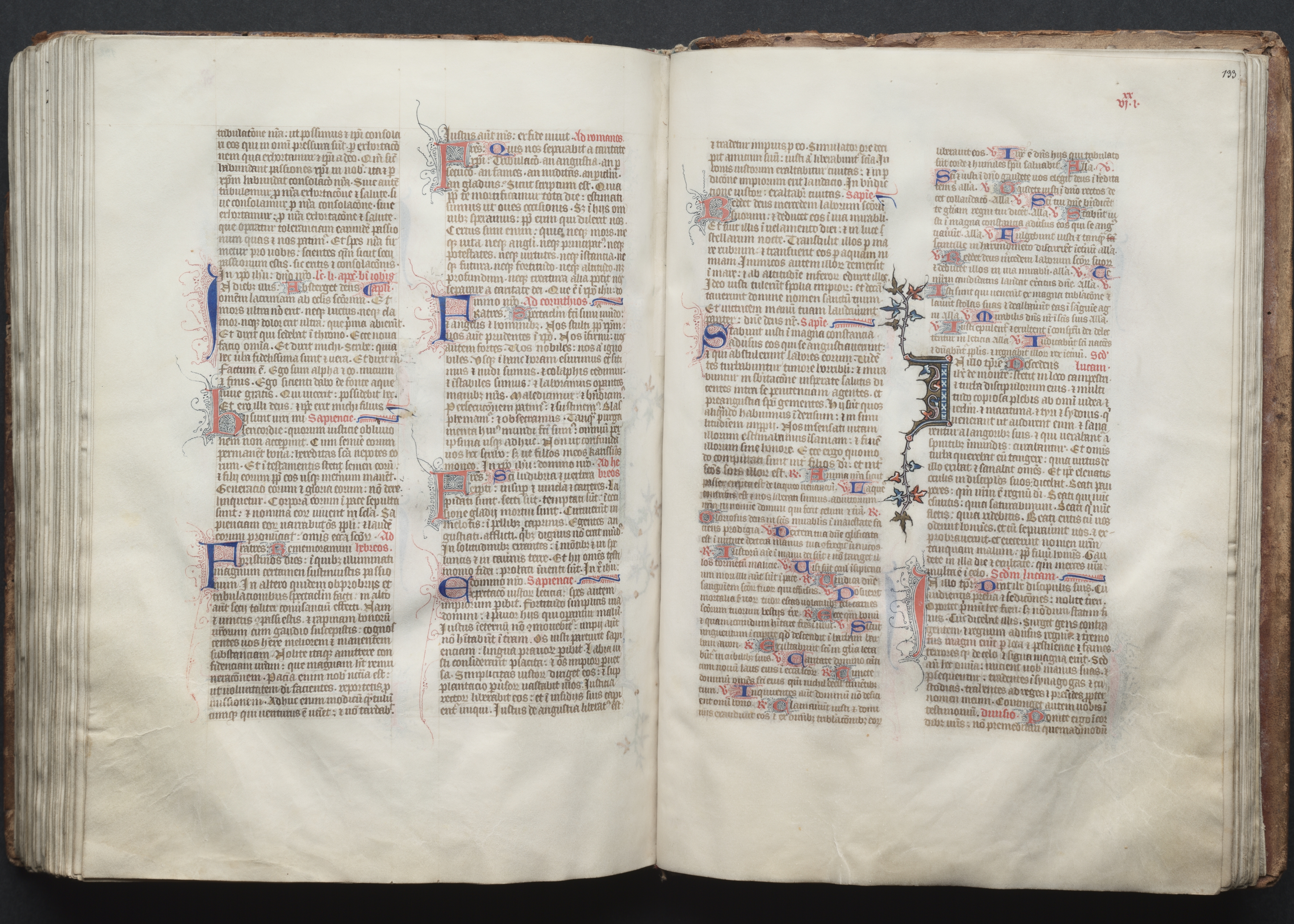 Open book with two pages. Pages have yellowed with age. Pages have text printed in black ink with some words in red. Several letters are hand-illuminated with blue and red ink. A decorative design on right page features a large letter with blue, red and gold colors. The design element starts on the top right and ends at the bottom middle of the page. There are floral features. The pages are wrinkled and show signs of aging. The book cover is brown. Most of the book is on a black background.