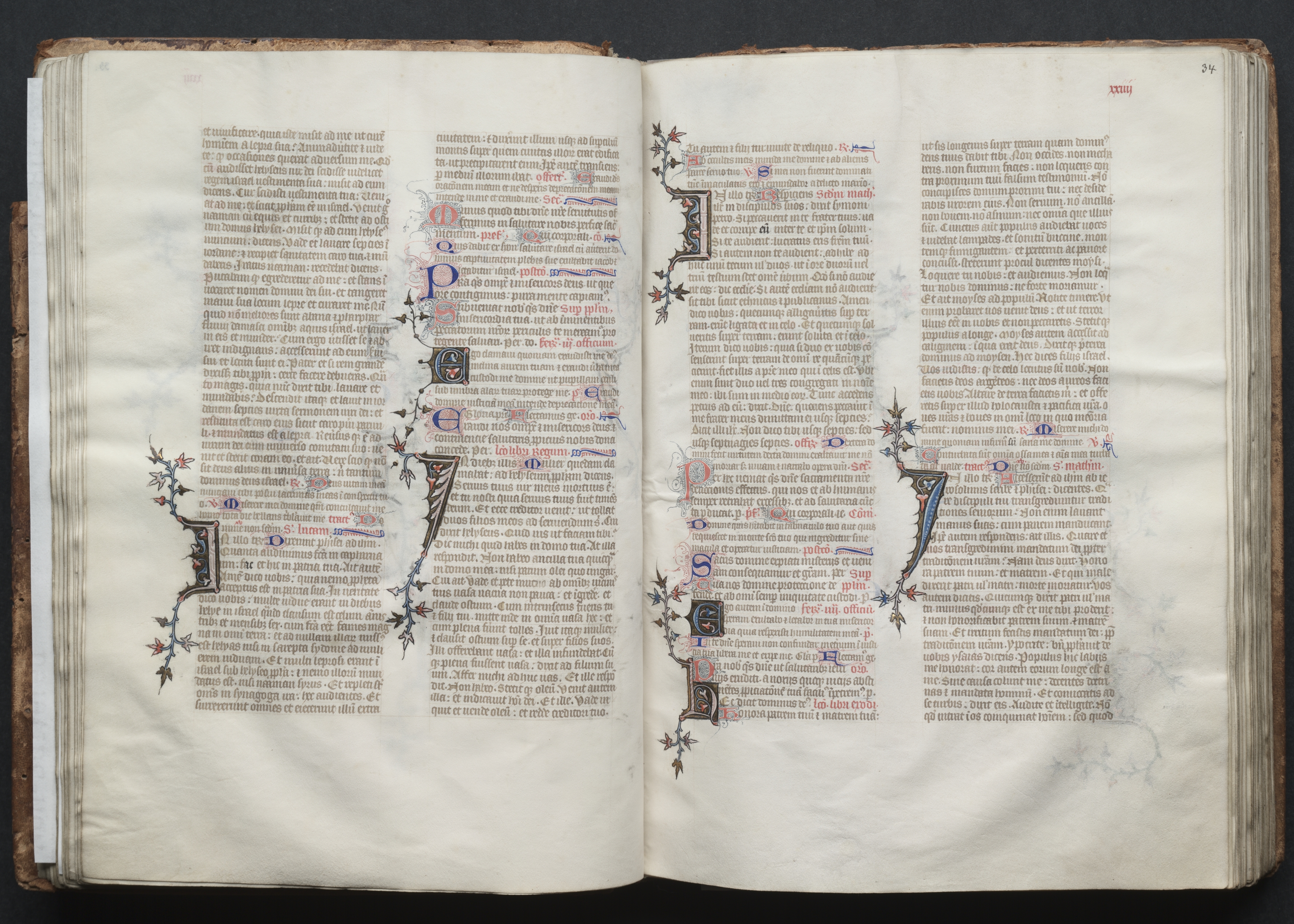 The image shows an open, old book with yellowed pages. The pages are white with black text in a language that appears to be Latin. The text is arranged in columns, with two columns on the left page and two on the right. There are decorative letters and illustrations throughout the text. The pages are worn and have a brownish tint around the edges. The book is bound in brown leather, and the spine is visible on the left side of the image. The background of the image is black. A white border surrounds the image. A small red number "34" is visible in the top right corner of the right page. A small red number is visible in the top center of the left page, but it is not legible.
