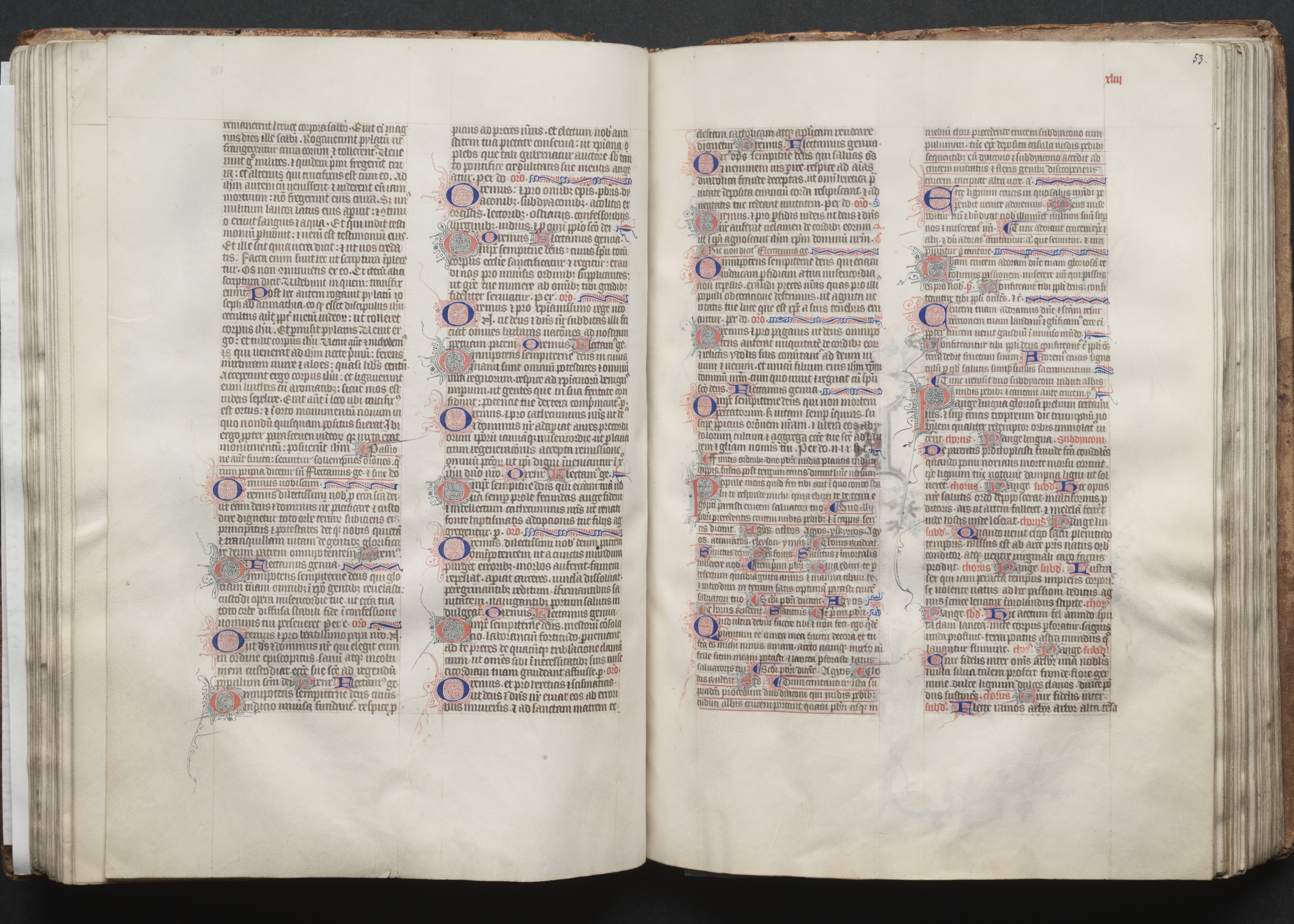 Open book with yellowed pages, brown leather binding, showing two pages of black text in a medieval style, with decorative initial letters in blue and red, illuminated borders, and red accents, on a black background.