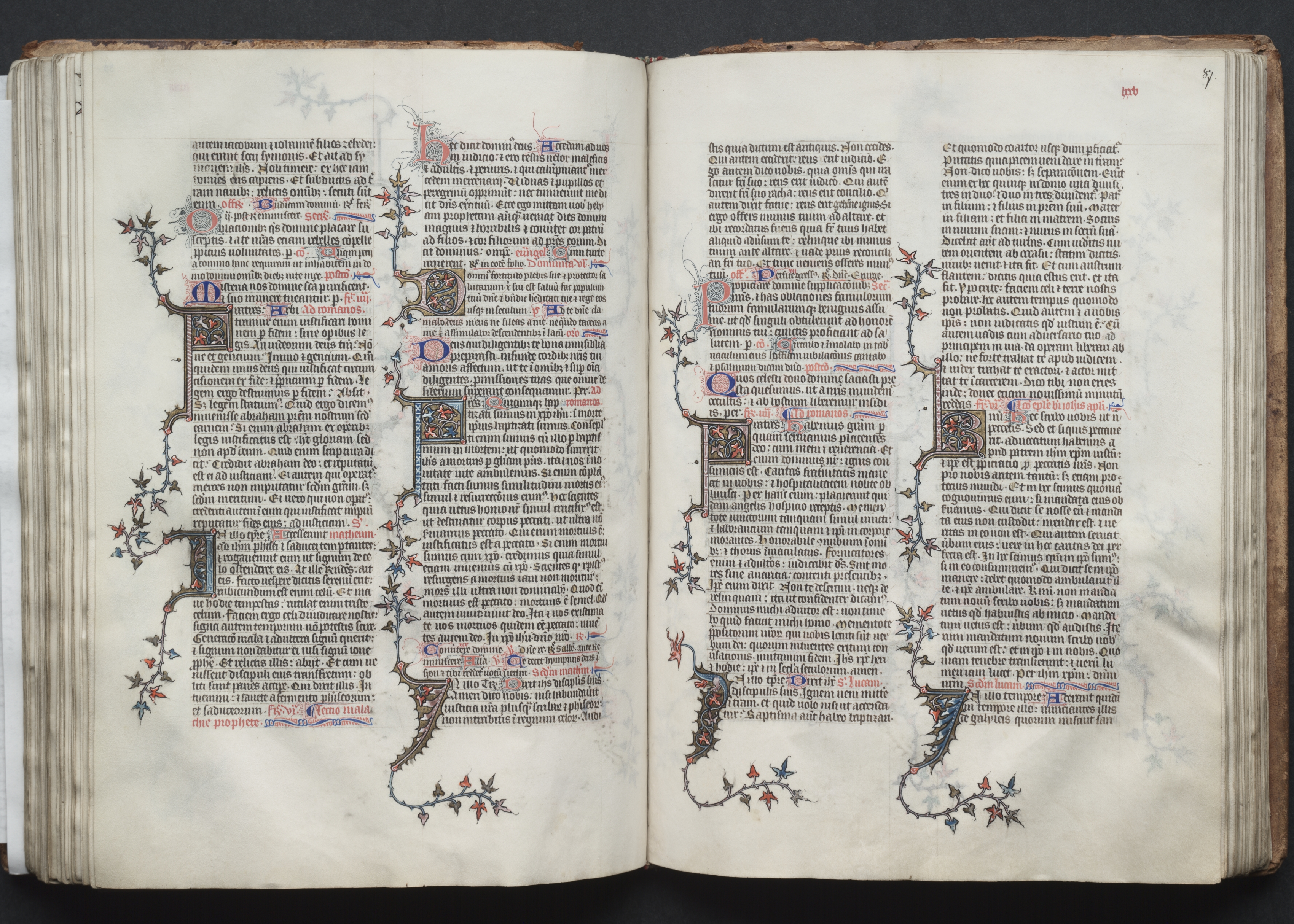 Open book with two pages. The book lies flat on a dark surface. The paper is off-white and aged. The edges of the pages are worn. The pages have black text in a language that is not English. The text on both pages is arranged in two columns. Decorative designs border the text on both sides. The designs on both pages are similar. The designs contain leaves and flowers. The designs are colored red, blue, gold, and black. The designs are on both the top and bottom of the pages. There are also decorated squares on both pages with red, blue and gold details. The right page has the number "87" written in red ink on the top right. The left page has a pencil notation on the top left edge. The book's spine is on the left.