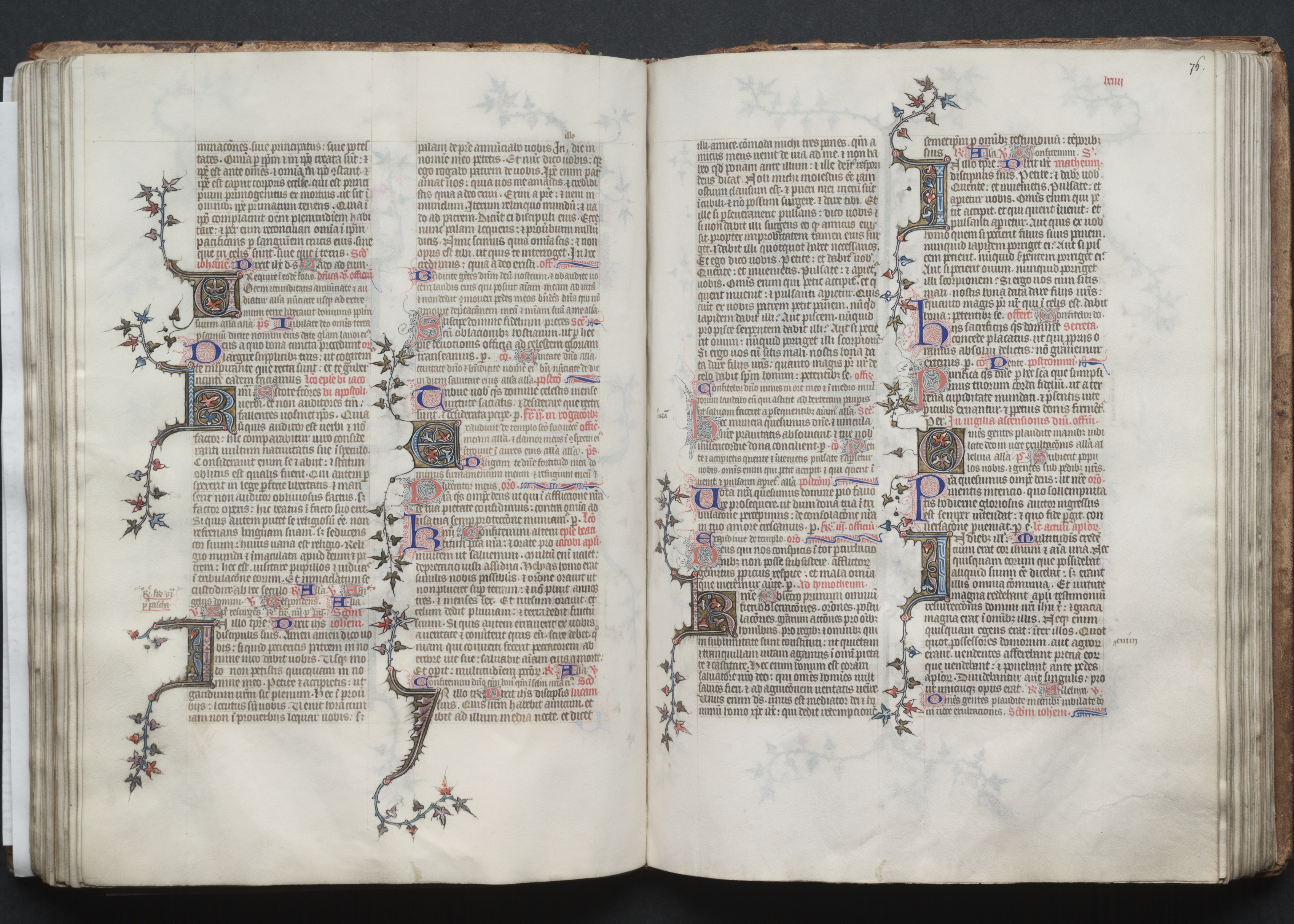 Open book with yellowed pages. Pages have black text in columns and are decorated with colorful designs. The pages have marbling and staining. A vine-like pattern borders the pages in blue, red and gold with leaves and flowers. There are large colored initials throughout the text. The pages are numbered in red on the top right. The book has a brown cover.