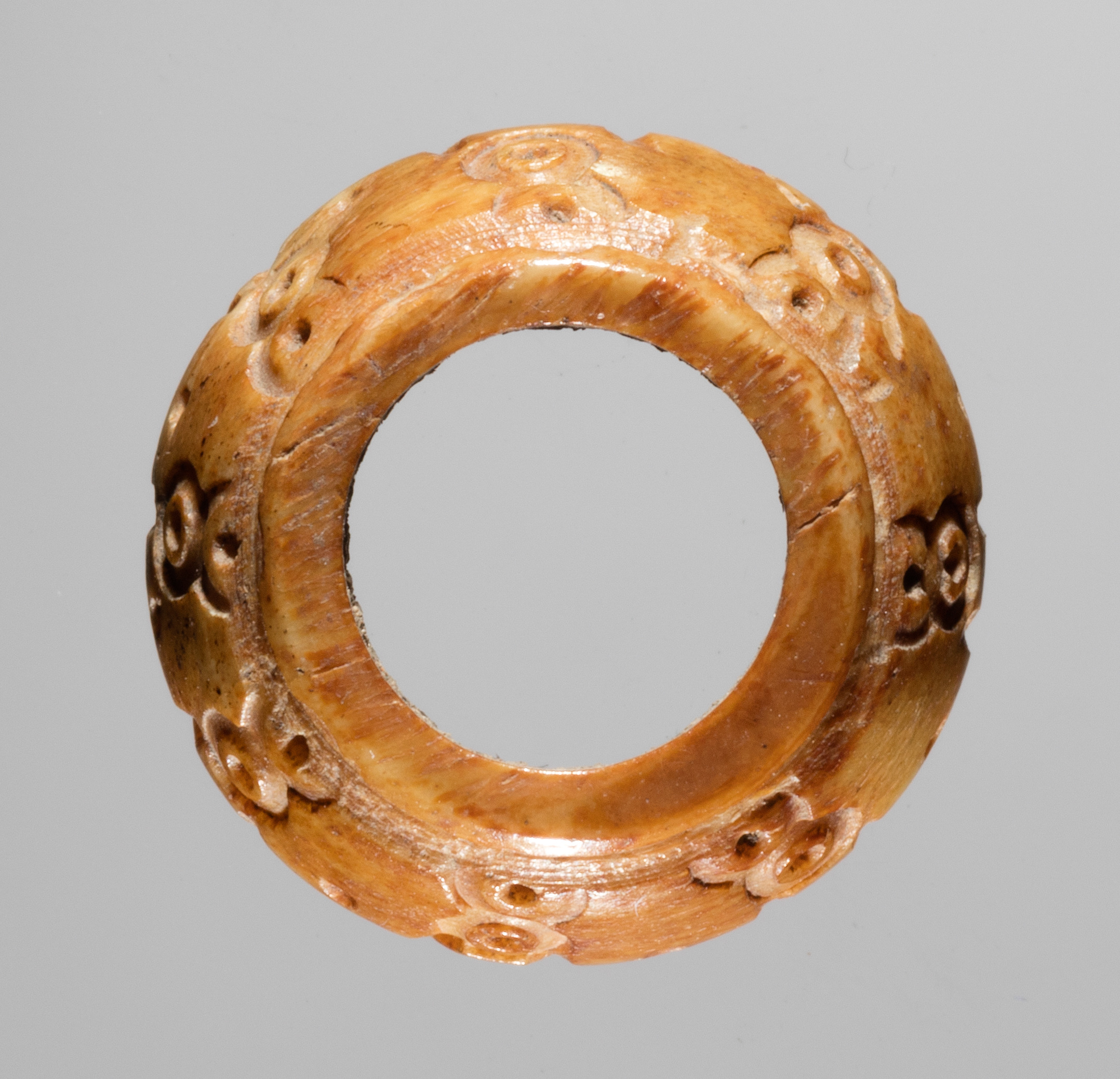 The Spindle Whorl by Unknown is a circular object with a large central hole. The object is made of a light brown material, possibly wood or bone, and has a glossy finish. It is carved with a pattern of raised designs around its outer edge. The designs appear to be floral or geometric in nature. The object is symmetrical, with the same pattern repeated around its entire circumference. The background of the image is a plain gray color.