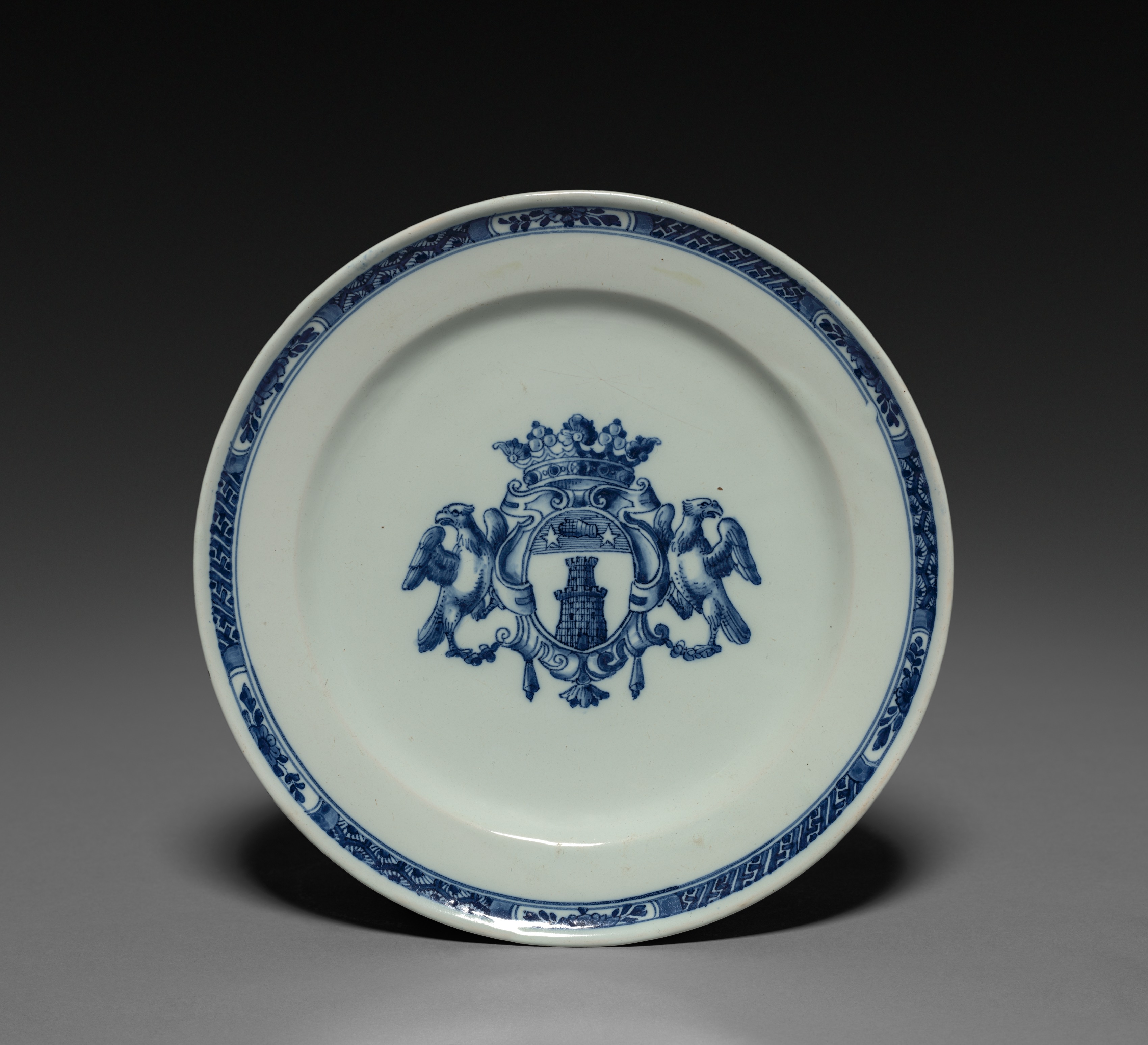 The plate "Plate" by the artist is round and white with a blue design. The plate has a wide rim with a blue patterned border. Inside the plate, there is a large blue design in the center featuring a crest with two birds on either side. The crest is topped with a crown and has a tower in the middle. The background of the image is dark gray, with the plate casting a shadow. The plate appears to be ceramic or porcelain. The overall design is symmetrical.
