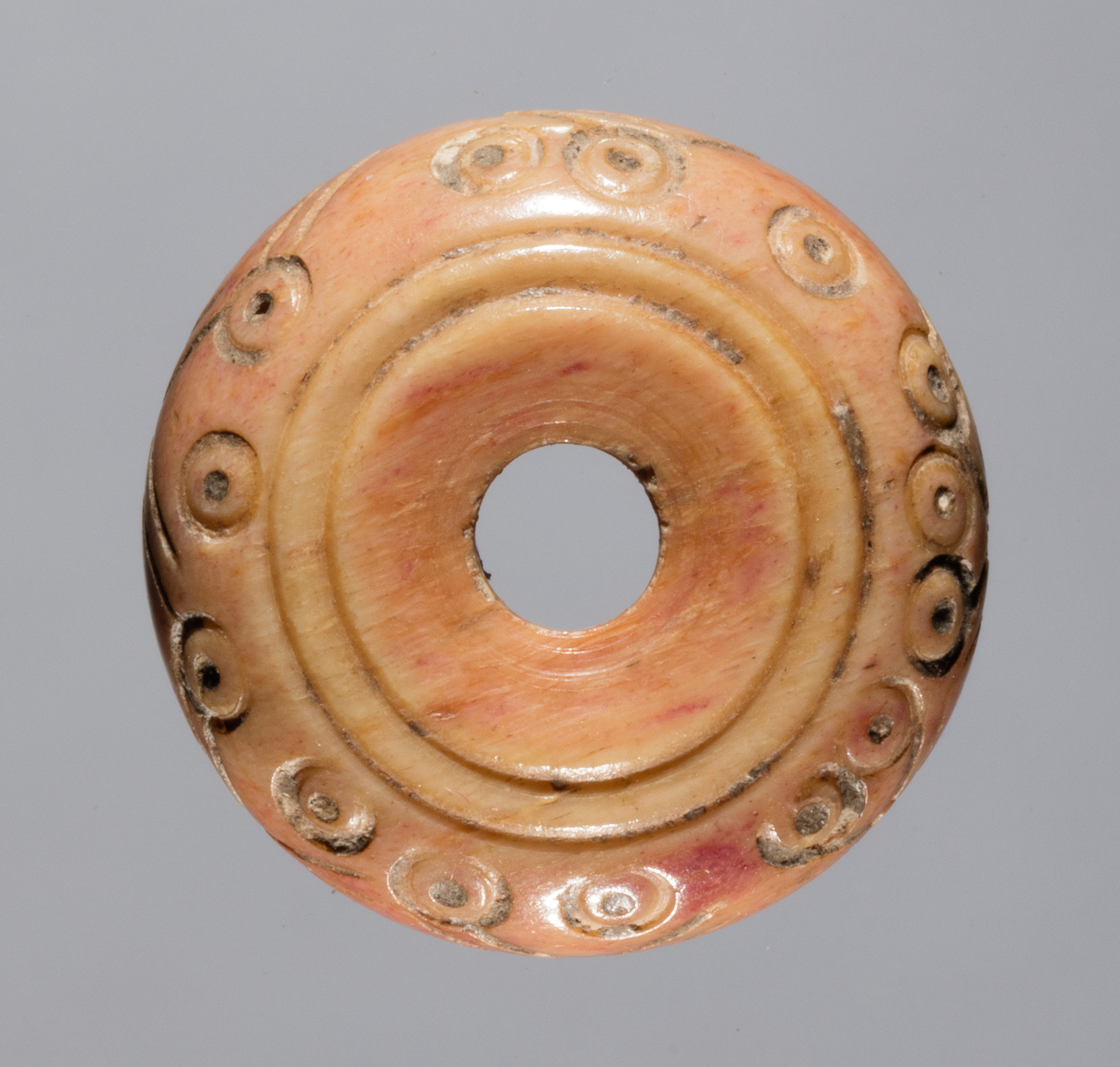 Spindle whorl by unknown artist. A circular, flat object with a hole in the center, made of light-colored stone or ceramic material. The object has a smooth surface with a subtle sheen and exhibits a predominantly light orange coloration, with darker orange and red undertones visible. The outer edge features a decorative pattern of small, raised circles. The hole in the center is round and smooth. The background of the image is gray.