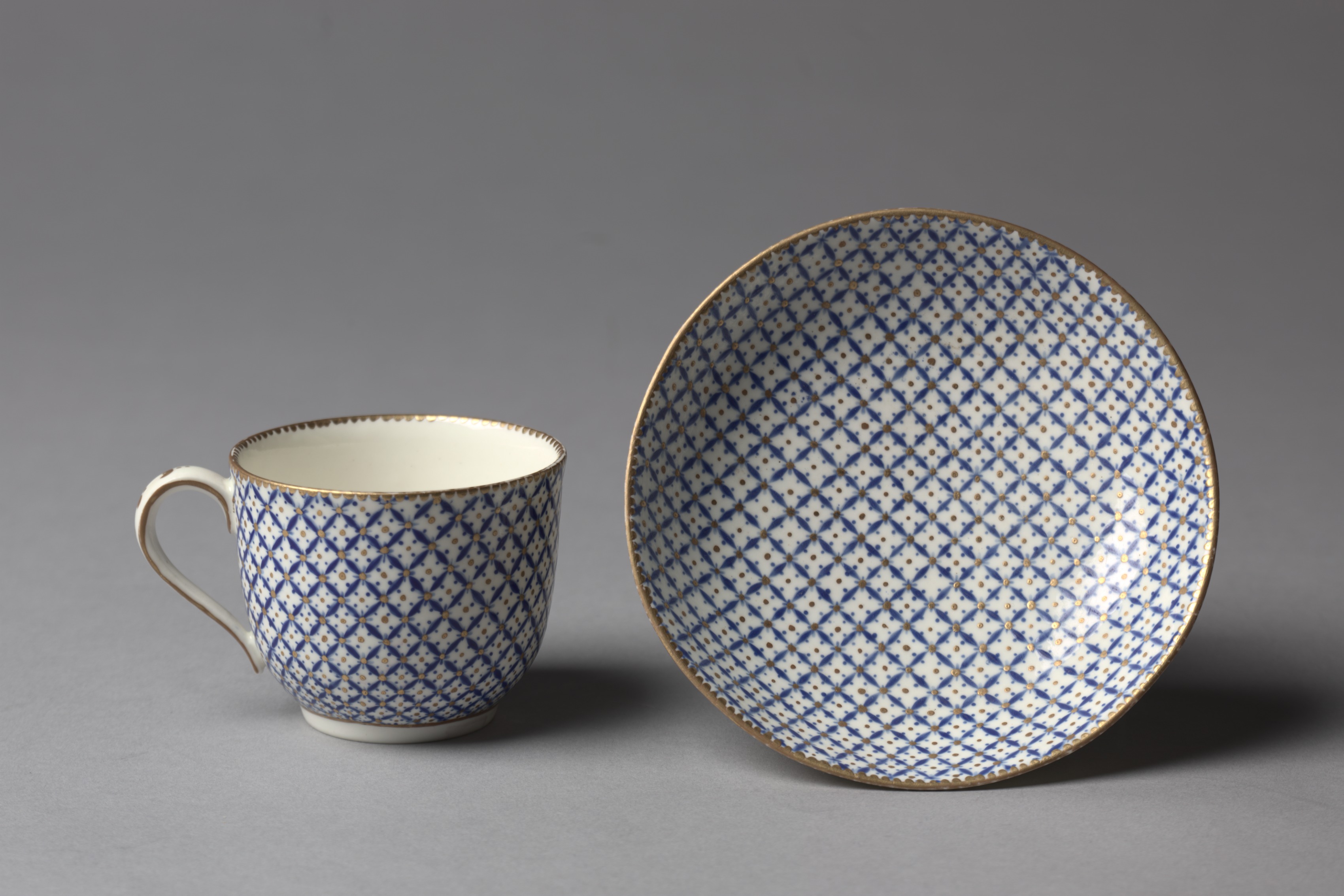 The image shows a cup and saucer. The cup is on the left side. It has a handle on the left. The cup and saucer are white with a blue and gold pattern. The pattern consists of blue lines forming diamonds with a small gold dot in the center of each diamond. The rim of the cup and saucer has a gold trim with small spikes. The saucer is on the right side, and it is larger and more shallow than the cup. The background is gray.