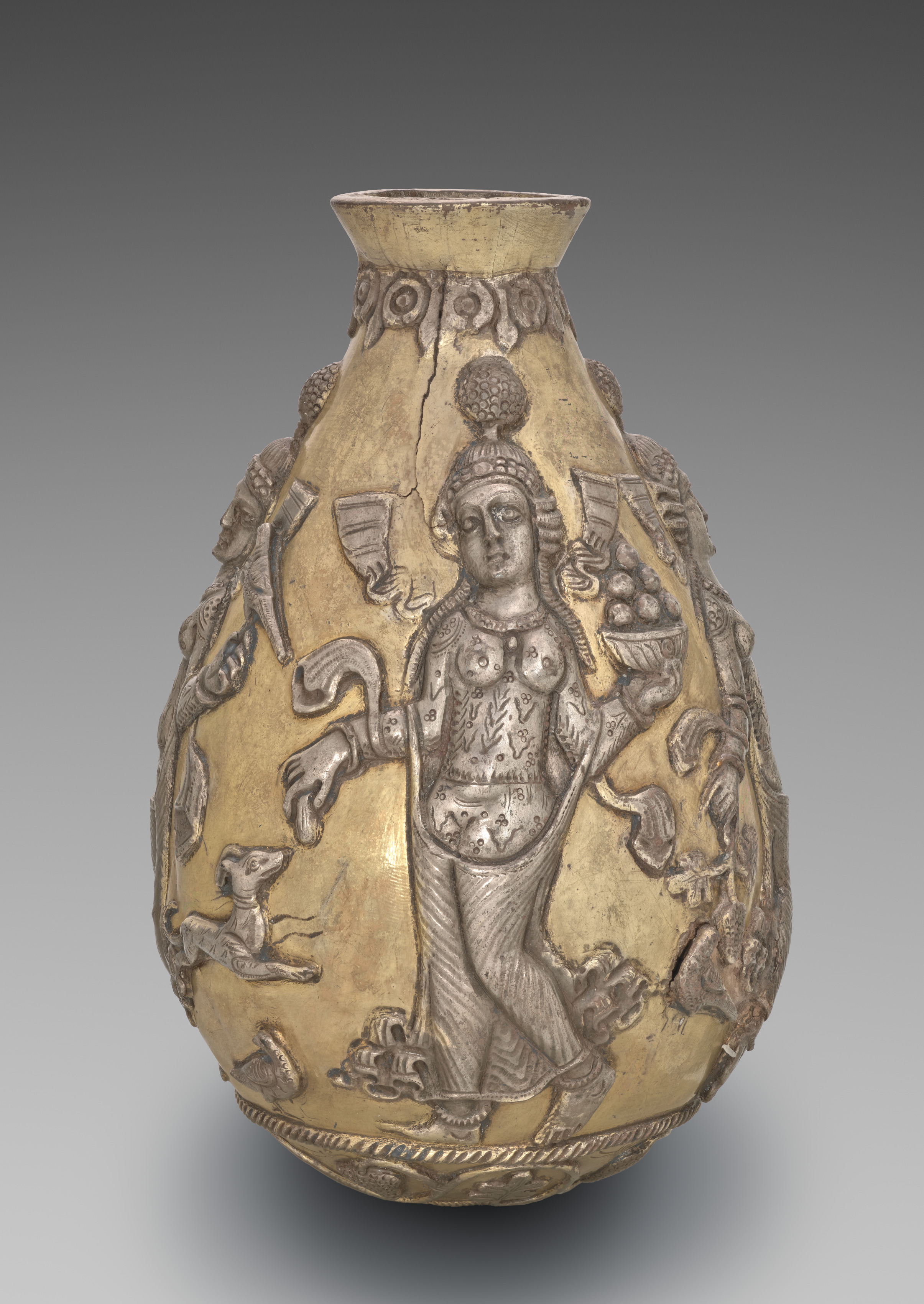 The Anahita Vessel by artist is a gold and silver vase. It is bulbous in shape with a short neck and wide mouth. A woman with long hair and a headpiece stands on the front. She holds a fruit bowl in one hand and a scepter-like object in the other. The woman wears a long skirt and top with detailed patterns. The vase features various animals, including a dog, around the body. The top of the vase has a decorative border. The background is gray.