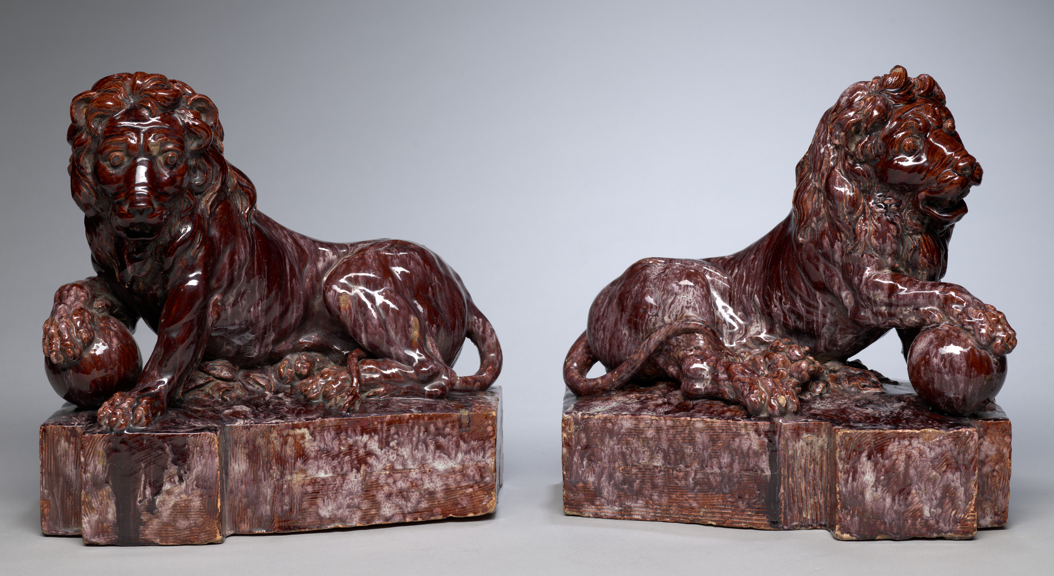 The image features a pair of brown statues of lions. The statues are made of dark reddish-brown stone or ceramic material with a glossy finish. The lions are depicted lying down on rectangular bases with their front paws resting on balls. The lion on the left is facing forward and slightly to the left, while the lion on the right is facing to the right. Both lions have thick manes and tails that are curled up. The background of the image is a gradient gray color. The statues are symmetrical, with one on the left and one on the right. The title of the image is "Pair of Lions".