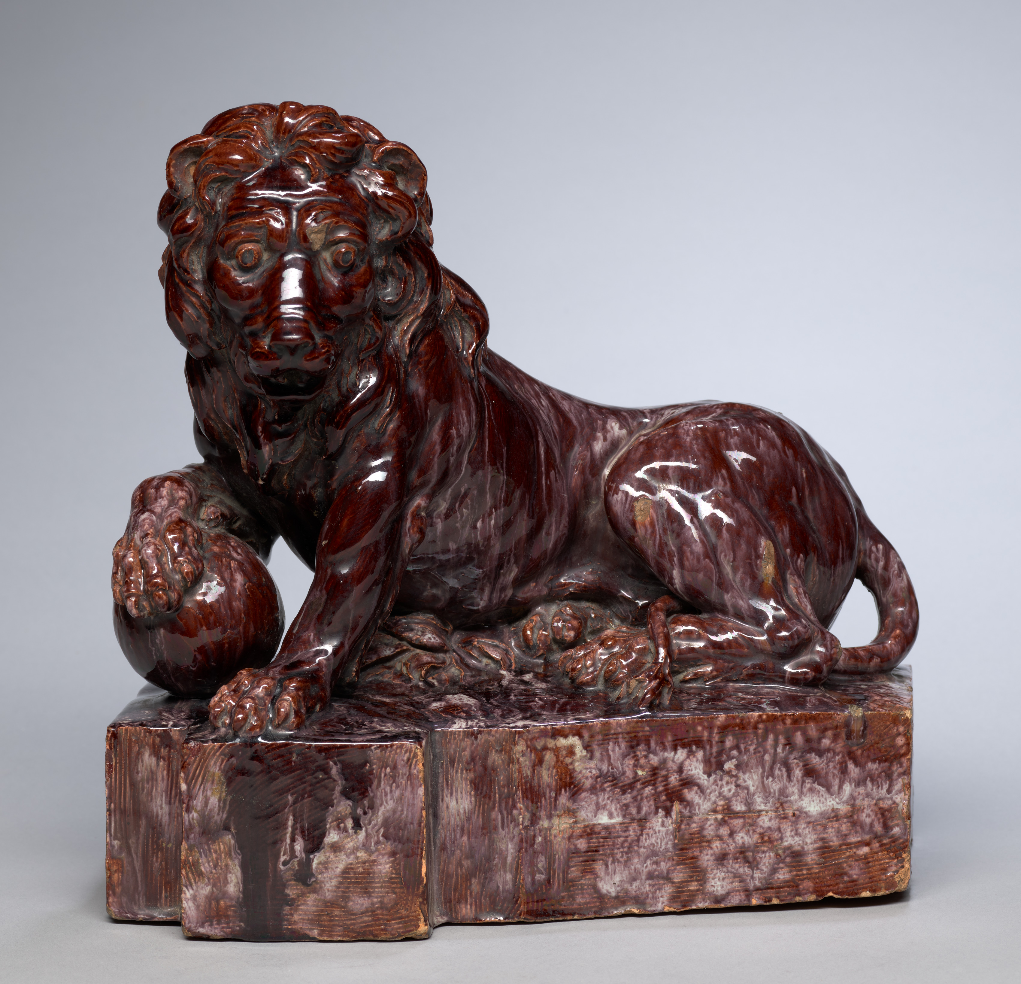 Glossy dark reddish-brown sculpture of Lion by artist Edmund Blundell, depicting a reclining lion with a shaggy mane and a detailed face, the lion's body is positioned on a rectangular base with a textured surface. The lion's right paw rests on a ball, while its left paw is extended. The sculpture has a dark reddish-brown color with lighter patches on the base.