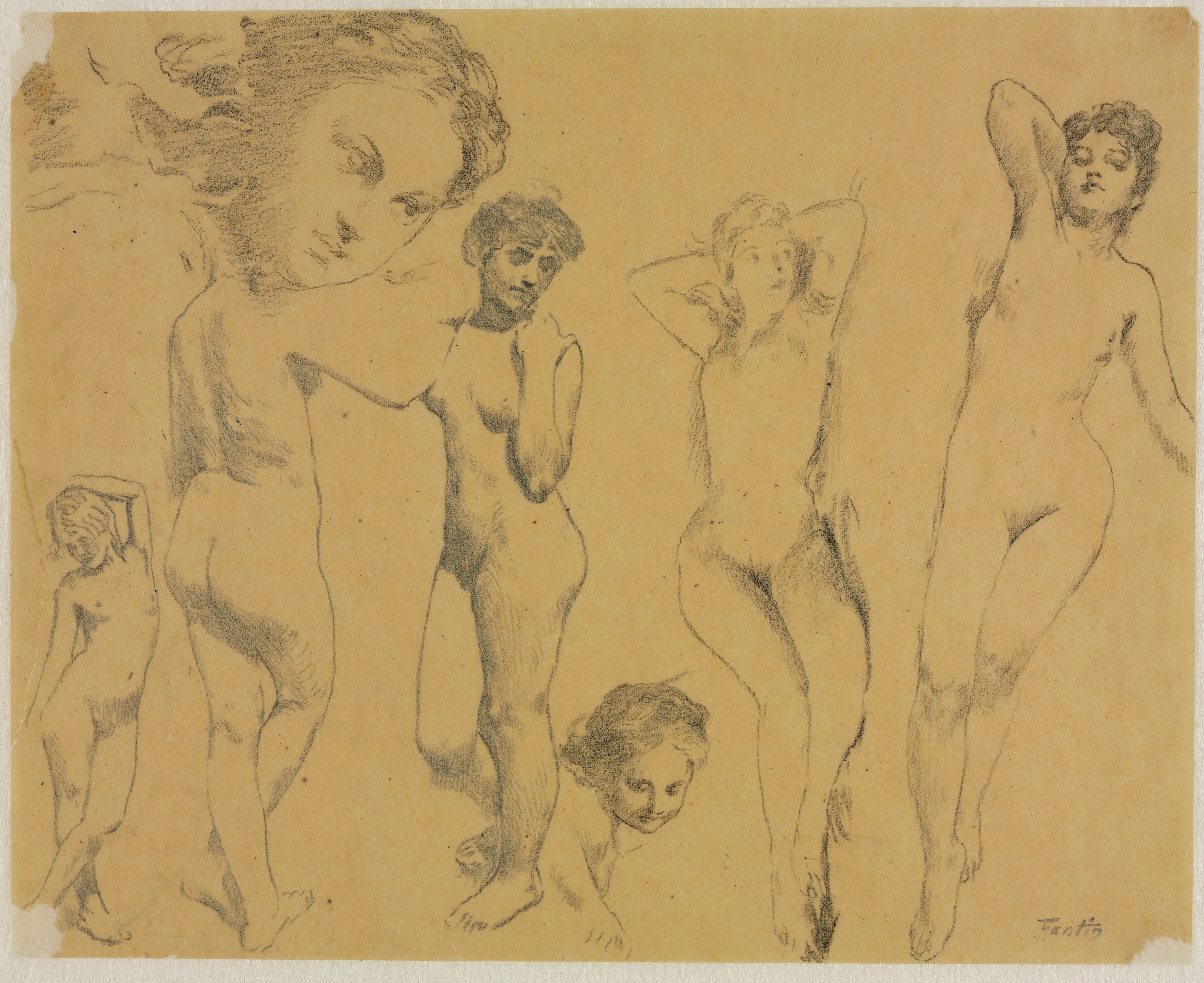 A group of six nude female figures sketched in pencil on yellowed paper. The figures vary in pose and size. One large figure's head and shoulders are at the top left. A small figure crouches at the bottom center. Three figures stand in the center. A figure on the far right stands with arms raised. A small figure stands on the far left. The background is solid yellowed paper. The artist's signature appears in the bottom right corner.