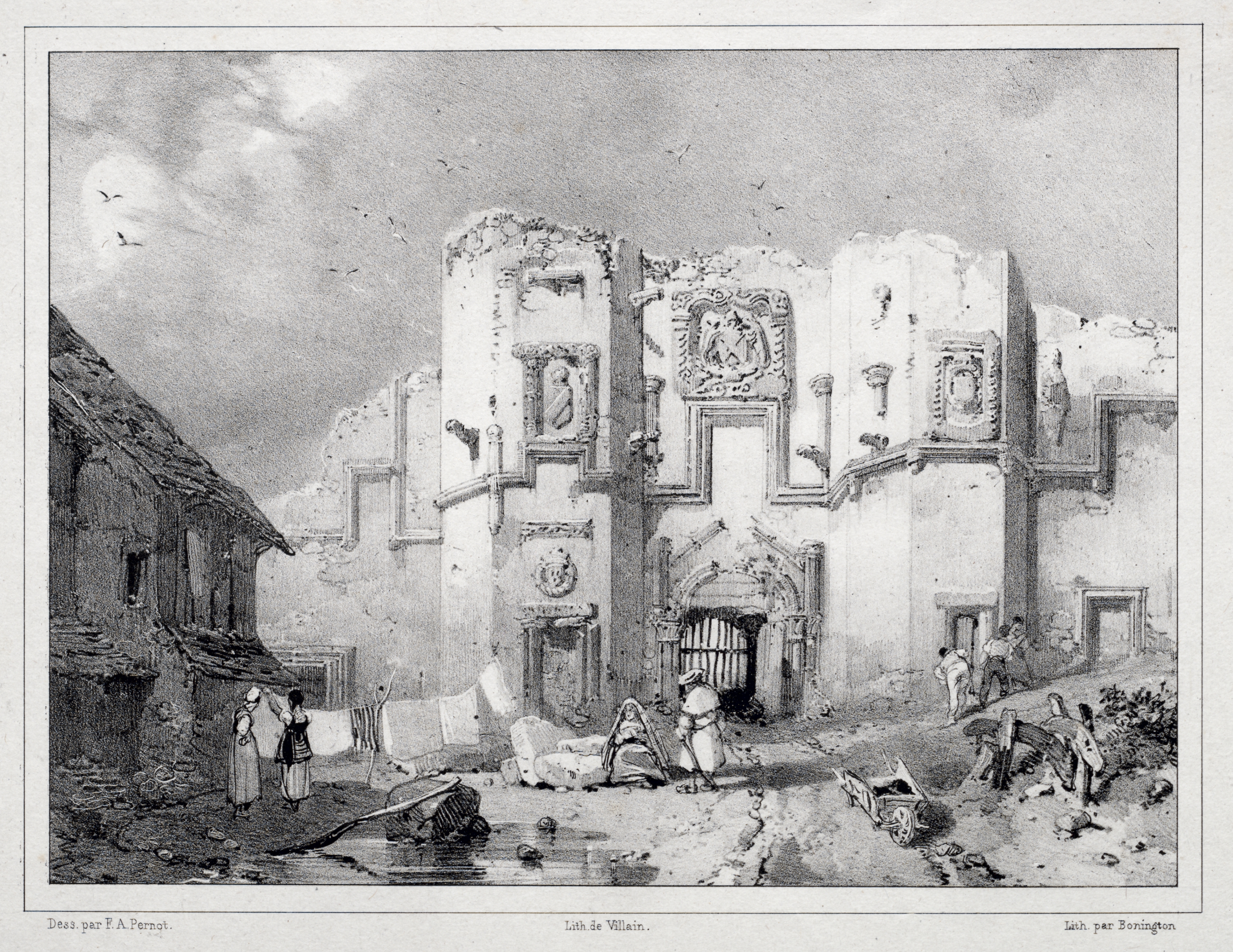 The scene depicts the remains of an old gateway with a large, ornate stone entrance. The gateway is white and has a large gate with a metal grille. There are several figures of people in front of and around the gateway. A horse-drawn cart is on the road in front of the gate. A house with a slanted roof is on the left. The sky is cloudy with birds flying in it.